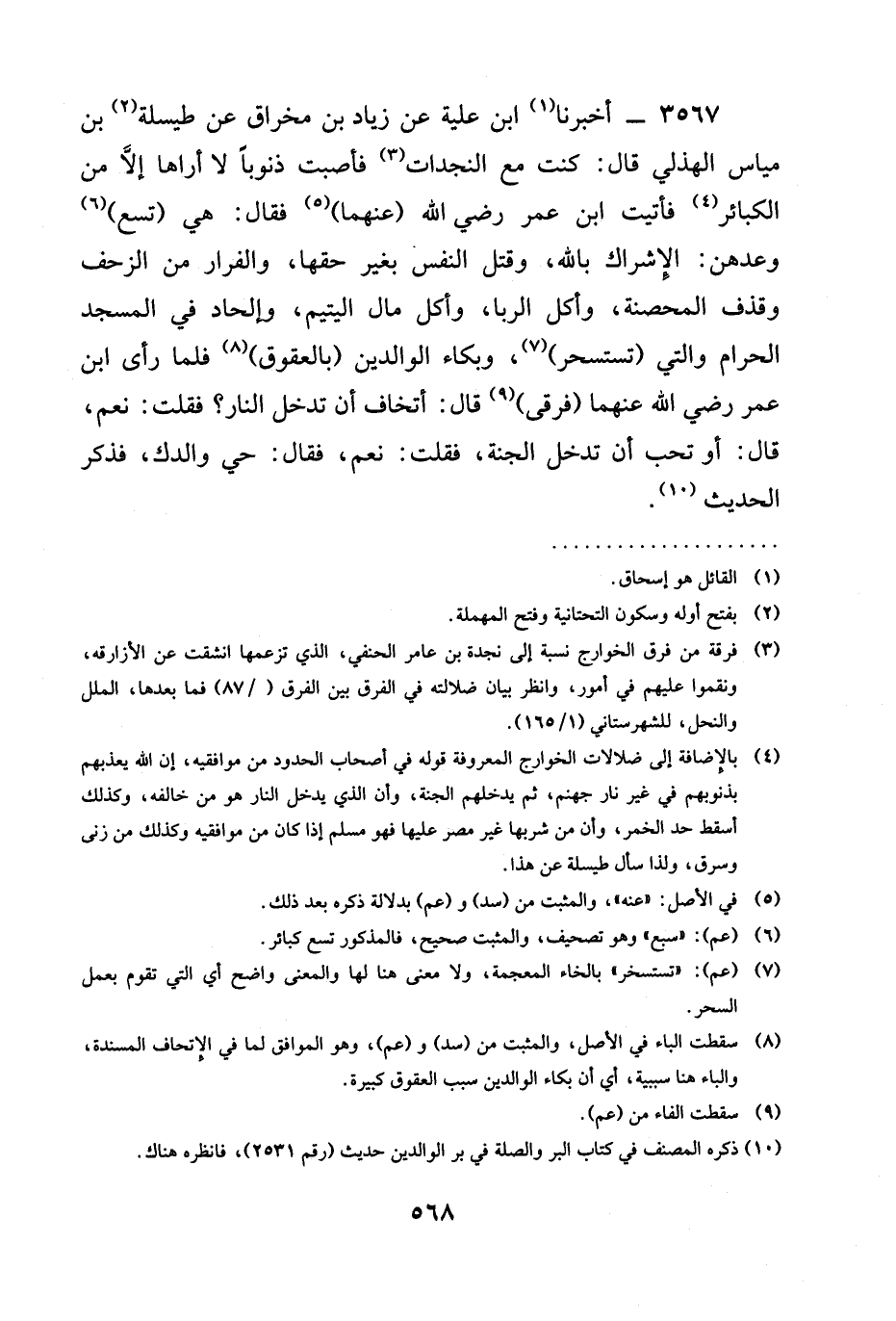 3567 - أخبرنا ابْنُ عُلَيَّةَ عَنْ زِيَادِ بْنِ مِخْرَاقٍ عَنْ طَيْسَلَةَ بْنِ مَيَّاسٍ الْهُذَلِيِّ قَالَ: كُنْتُ مَعَ النَّجَدَاتِ فَأَصَبْتُ ذُنُوبًا لَا أُرَاهَا إِلَّا مِنَ الْكَبَائِرِ فَأَتَيْتُ ابْنَ عُمَرَ رضي الله (عنهما) فَقَالَ: §هِيَ (تِسْعٌ) وَعَدَّهُنَّ: الْإِشْرَاكُ بِاللَّهِ، وَقَتْلُ النَّفْسِ بِغَيْرِ حَقِّهَا، وَالْفِرَارُ مِنَ الزَّحْفِ وَقَذْفُ الْمُحْصَنَةِ، وَأَكْلُ الرِّبَا، وَأَكْلُ مَالِ الْيَتِيمِ، وَإِلْحَادٌ فِي الْمَسْجِدِ الْحَرَامِ وَالَّتِي (تَسْتَسْحِرُ) ، وَبُكَاءُ الْوَالِدَيْنِ (بِالْعُقُوقِ) فَلَمَّا رَأَى ابْنُ عُمَرَ رَضِيَ الله عَنْهما (فَرَقِي) قَالَ: أَتَخَافُ أَنْ تَدْخُلَ النَّارَ؟ فَقُلْتُ: نَعَمْ، قال: أو تحب أَنْ تَدْخُلَ الْجَنَّةَ، فَقُلْتُ: نَعَمْ، فَقَالَ: حي والدك، فَذَكَرَ الْحَدِيثَ.