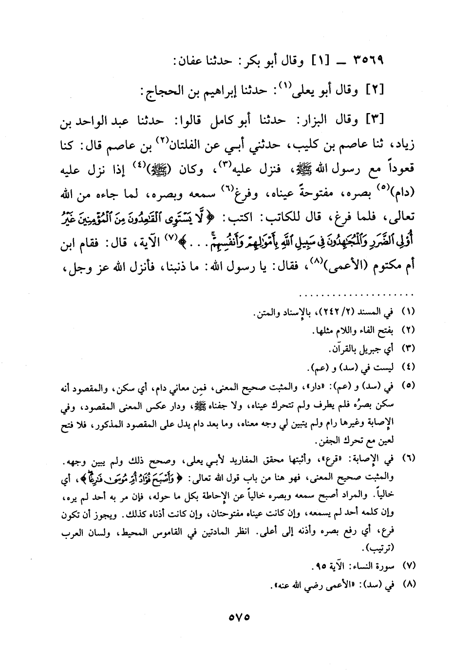 [3] وَقَالَ الْبَزَّارُ: حدثنا أَبُو كَامِلٍ قَالُوا: حدثنا عَبْدُ الْوَاحِدِ بْنُ زِيَادٍ، ثنا عَاصِمُ بْنُ كُلَيْبٍ، حَدَّثَنِي أَبِي عَنِ الْفَلْتَانِ بْنِ عَاصِمٍ قَالَ: كُنَّا قُعُودًا مَعَ رَسُولِ اللَّهِ صَلَّى اللَّهُ عَلَيْهِ وَسَلَّمَ، فَنَزَلَ عَلَيْهِ، وَكَانَ (صَلَّى اللَّهُ عَلَيْهِ وَسَلَّمَ) إِذَا نَزَلَ عَلَيْهِ (دَامَ) بَصَرَهُ، مَفْتُوحَةٌ عَيْنَاهُ، وَفَرَغَ سَمْعُهُ وَبَصَرُهُ، لِمَا جَاءَهُ مِنَ اللَّهِ تعالى، فَلَمَّا فَرَغَ، قَالَ لِلْكَاتِبِ: §اكْتُبْ: {لَا يَسْتَوِي الْقَاعِدُونَ مِنَ الْمُؤْمِنِينَ غير أولي الضرر وَالْمُجَاهِدُونَ فِي سَبِيلِ اللَّهِ بِأَمْوَالِهِمْ وَأَنْفُسِهِمْ} الْآيَةَ، قَالَ: فَقَامَ ابْنُ أُمِّ مَكْتُومٍ (الْأَعْمَى) ، فَقَالَ: يَا رَسُولَ اللَّهِ: مَا ذَنْبُنَا، فَأَنْزَلَ اللَّهُ عز وجل،
