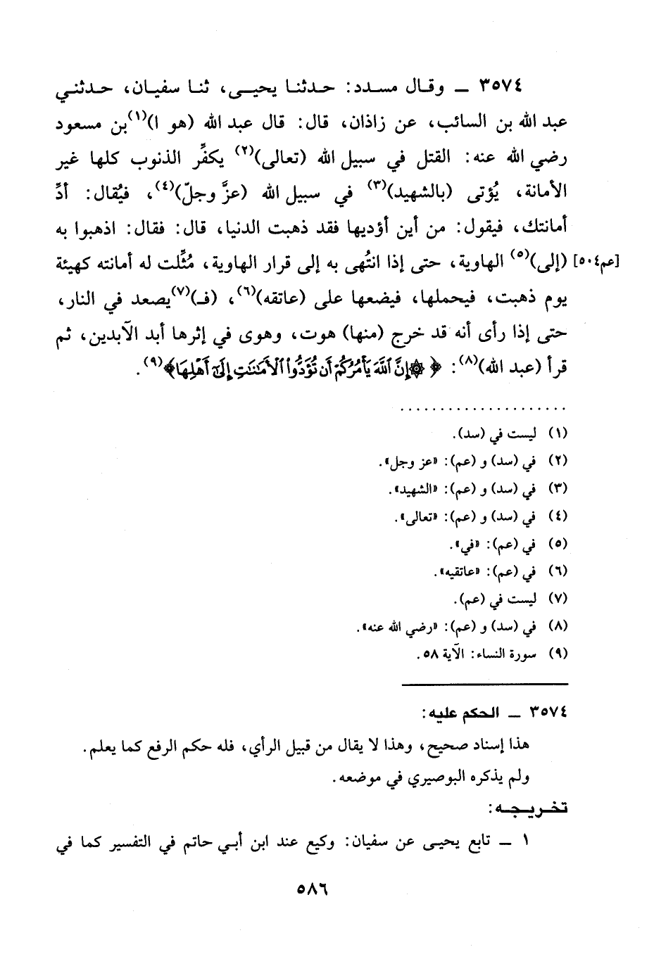 3574 - وَقَالَ مُسَدَّدٌ: حدثنا يَحْيَى، ثنا سُفْيَانُ، حَدَّثَنِي عَبْدُ اللَّهِ بْنِ السَّائِبِ، عَنْ زَاذَانَ، قَالَ: قَالَ عَبْدُ اللَّهِ (هُوَ ا) بن مَسْعُودٍ رَضِيَ الله عَنْه: §الْقَتْلُ فِي سَبِيلِ اللَّهِ (تعالى) يُكَفِّرُ الذُّنُوبَ كُلَّهَا غَيْرَ الْأَمَانَةِ، يُؤْتَى (بِالشَّهِيدِ) فِي سَبِيلِ اللَّهِ (عز وجل) ، فَيُقَالُ: أَدِّ أَمَانَتَكَ، فَيَقُولُ: مِنْ أَيْنَ أُؤَدِّيهَا فَقَدْ ذَهَبَتِ الدُّنْيَا، قَالَ: فقال: اذْهَبُوا بِهِ (إِلَى) الْهَاوِيَةِ، حَتَّى إِذَا انْتُهِيَ بِهِ إِلَى قَرَارِ الْهَاوِيَةِ، مُثِّلَتْ لَهُ أَمَانَتُهُ كَهَيْئَةِ يَوْمَ ذَهَبَتْ، فَيَحْمِلُهَا، فَيَضَعُهَا عَلَى (عَاتِقِهِ) ، (ف) يصعد فِي النَّارِ، حَتَّى إِذَا رَأَى أَنَّهُ قَدْ خَرَجَ (مِنْهَا) هَوَتْ، وَهَوَى فِي إِثْرِهَا أَبَدَ الْآبِدِينَ، ثُمَّ قَرَأَ (عَبْدُ اللَّهِ) : {إِنَّ اللَّهَ يَأْمُرُكُمْ أَنْ تُؤَدُّوا الْأَمَانَاتِ إِلَى أَهْلِهَا} .