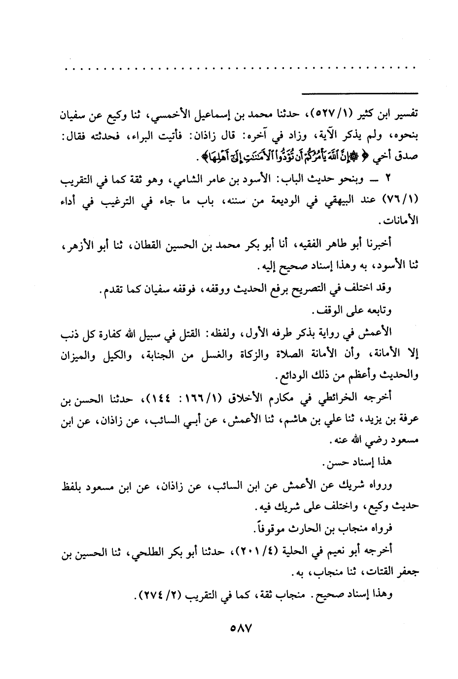 = تفسير ابن كثير (1/ 527)، حدّثنا محمد بن إسماعيل الأخمسي، ثنا وكيع عن سفيان بنحوه، ولم يذكر الآية، وزاد في آخره: قال زاذان: فأتيت البراء، فحدثته فقال: صدق أخي {إِنَّ اللَّهَ يَأْمُرُكُمْ أَنْ تُؤَدُّوا الْأَمَانَاتِ إِلَى أَهْلِهَا}.