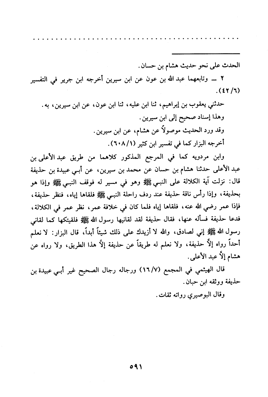 وابن مردويه كما في المرجع المذكور كلاهما من طريق عبد الأعلى بن عبد الأعلى حَدَّثَنَا هِشَامِ بْنِ حَسَّانَ عَنْ مُحَمَّدِ بْنِ سِيرِينَ، عن أبي عبيدة بن حذيفة قال: نزلت آية الكلالة عَلَى النَّبِيِّ -صَلَّى اللَّهُ عَلَيْهِ وَسَلَّمَ- وَهُوَ فِي مسير له فوقف النبي -صلى الله عليه وسلم- وإذا هو بحذيفة، وإذا رأس ناقة حذيفة عند ردف راحلة النبي -صلى الله عليه وسلم- فلقاها إياه، فنظر حذيفة، فإذا عمر رضي الله عنه، فلقاها إياه فلما كان في خلافة عمر، نظر عمر في الكلالة، فدعا حذيفة فسأله عنها، فقال حذيفة لقد لقانيها رسول الله -صلى الله عليه وسلم- فلقيتكها كما لقاني رَسُولُ اللَّهِ -صَلَّى اللَّهُ عَلَيْهِ وَسَلَّمَ- إِنِّي لصادق، والله لا أزيدك على ذلك شيئًا أبدًا، قال البزّار: لا نعلم أحدًا رواه إلَّا حذيفة، ولا نعلم له طريقًا عن حذيفة إلَّا هذا الطريق، ولا رواه عن هشام إلَّا عبد الأعلى.
