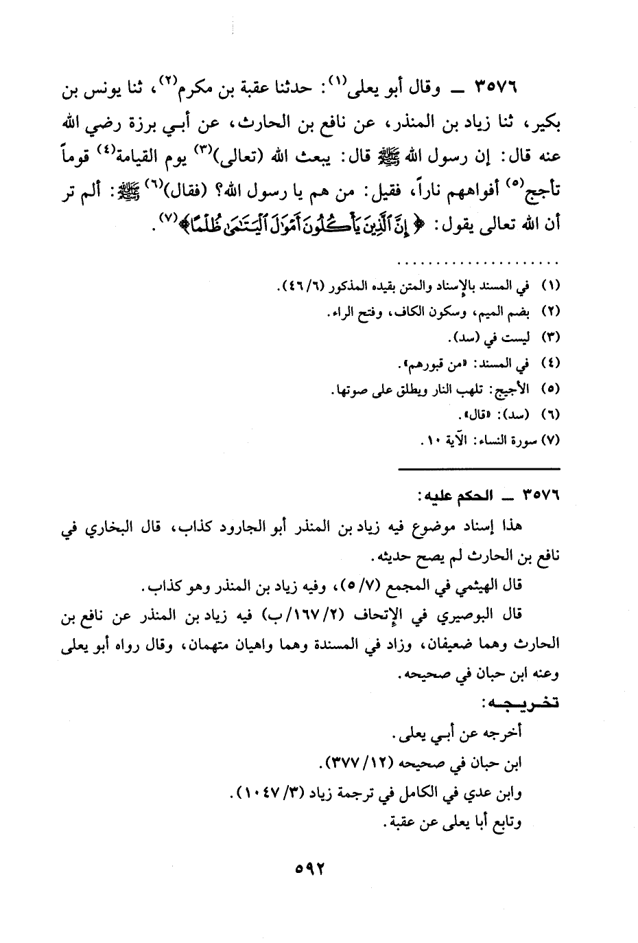 3576 - وَقَالَ أَبُو يَعْلَى: حدثنا عُقْبَةُ بْنُ مُكْرَمٍ، ثنا يُونُسُ بْنُ بُكَيْرٍ، ثنا زِيَادُ بْنُ الْمُنْذِرِ، عَنْ نَافِعِ بْنِ الْحَارِثِ، عَنْ أَبِي بَرْزَةَ رَضِيَ الله عَنْه قَالَ: إِنَّ رَسُولَ اللَّهِ صَلَّى اللَّهُ عَلَيْهِ وَسَلَّمَ قَالَ: §يَبْعَثُ اللَّهُ (تعالى) يَوْمَ الْقِيَامَةِ قَوْمًا تَأَجَّجَ أَفْوَاهُهُمْ نَارًا، فَقِيلَ: مَنْ هُمْ يَا رَسُولَ اللَّهِ؟ (فَقَالَ) صَلَّى اللَّهُ عَلَيْهِ وَسَلَّمَ: أَلَمْ تَرَ أَنَّ اللَّهَ تَعَالَى يَقُولُ: {إِنَّ الَّذِينَ يَأْكُلُونَ أَمْوَالَ الْيَتَامَى ظُلْمًا} .