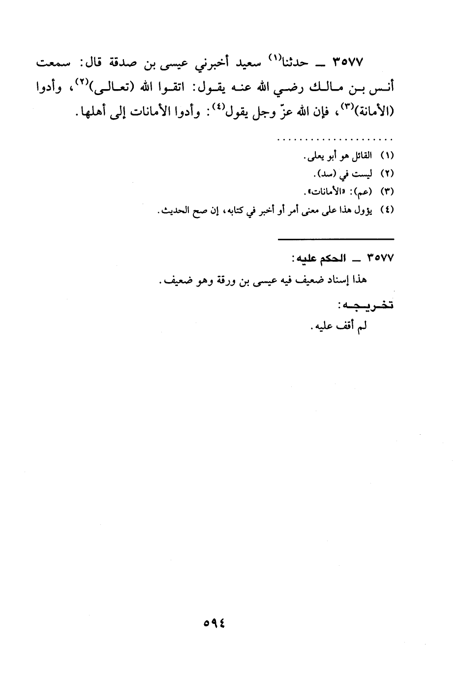 3577 - حدثنا سَعِيدٌ أَخْبَرَنِي عِيسَى بْنُ صَدَقَةَ قَالَ: سَمِعْتُ أَنَسَ بْنَ مَالِكٍ رَضِيَ الله عَنْهُ يَقُولُ: §اتَّقُوا اللَّهَ (تعالى) ، وَأَدُّوا (الْأَمَانَةَ) ، فَإِنَّ اللَّهَ عَزَّ وَجَلَّ يَقُولُ: وأدوا الْأَمَانَاتِ إِلَى أَهْلِهَا.