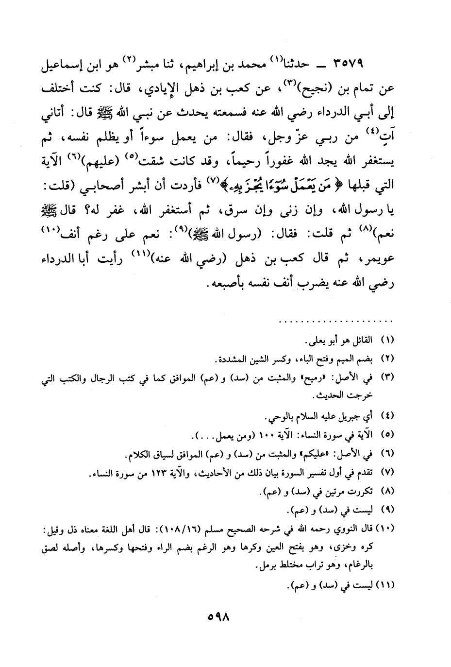 3579 - حدثنا مُحَمَّدُ بْنُ إِبْرَاهِيمَ، ثنا مُبَشِّرٌ هُوَ ابْنُ إِسْمَاعِيلَ عَنْ تَمَامِ بْنِ (نَجِيحٍ) ، عَنْ كَعْبِ بْنِ ذُهْلٍ الْإِيَادِيِّ، قَالَ: كُنْتُ أَخْتَلِفُ إِلَى أَبِي الدَّرْدَاءِ رَضِيَ الله عَنْه فَسَمِعْتُهُ يُحَدِّثُ عَنْ نبي اللَّهِ صَلَّى اللَّهُ عَلَيْهِ وَسَلَّمَ قَالَ: §أَتَانِي آتٍ مِنْ رَبِّي عز وجل، فَقَالَ: مَنْ يَعْمَلْ سُوءًا أَوْ يَظْلِمْ نَفْسَهُ، ثُمَّ يَسْتَغْفِرِ اللَّهَ يَجِدِ اللَّهَ غَفُورًا رَحِيمًا، وَقَدْ كَانَتْ شَقَّتْ (عليهم) الْآيَةُ الَّتِي قَبْلَهَا {مَنْ يَعْمَلْ سُوءًا يُجْزَ بِهِ} فَأَرَدْتُ أَنْ أُبَشِّرَ أَصْحَابِي (قُلْتُ: يَا رَسُولَ اللَّهِ، وَإِنْ زَنَى وَإِنْ سَرَقَ، ثُمَّ اسْتَغْفَرَ اللَّهَ، غَفَرَ لَهُ؟ قَالَ صَلَّى اللَّهُ عَلَيْهِ وَسَلَّمَ نَعَمْ) ثُمَّ قُلْتُ [[يَا رَسُولَ اللَّهِ وَإِنْ زَنَى وَإِنْ سَرَقَ ثُمَّ اسْتَغْفَرَ غَفَرَ لَهُ؟ قَالَ: " نَعَمْ ". ثُمَّ ثَلَّثْتُ،]] (*) : فَقَالَ: (رَسُولُ اللَّهِ صَلَّى اللَّهُ عَلَيْهِ وَسَلَّمَ) : نَعَمْ عَلَى رَغْمِ أَنْفِ عُوَيْمِرٍ، ثُمَّ قَالَ كَعْبُ بْنُ ذُهْلٍ (رَضِيَ الله عَنْه) رَأَيْتُ أَبَا الدَّرْدَاءِ رَضِيَ الله عَنْه يَضْرِبُ أَنْفَ نَفْسِهِ بِأُصْبُعِهِ.