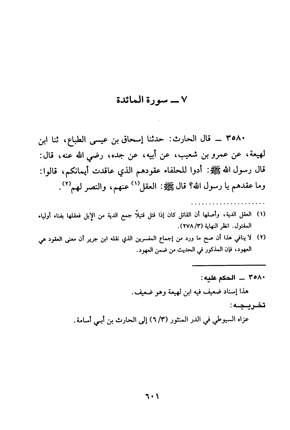3580 - قَالَ الْحَارِثُ: حدثنا إِسْحَاقُ بْنُ عِيسَى الطَّبَّاعُ، ثنا ابْنُ لَهِيعَةَ، عَنْ عَمْرِو بْنِ شُعَيْبٍ، عَنْ أَبِيهِ، عَنْ جَدِّهِ، رَضِيَ الله عَنْه، قَالَ: قَالَ رَسُولُ اللَّهِ صَلَّى اللَّهُ عَلَيْهِ وَسَلَّمَ: §أَدُّوا لِلْحُلَفَاءِ عُقُودَهُمُ الَّذِي عَاقَدَتْ أَيْمَانُكُمْ، قَالُوا: وَمَا عَقْدُهُمْ يَا رَسُولَ اللَّهِ؟ قَالَ صَلَّى اللَّهُ عَلَيْهِ وَسَلَّمَ: الْعَقْلُ عَنْهُمْ، وَالنَّصْرُ لَهُمْ.