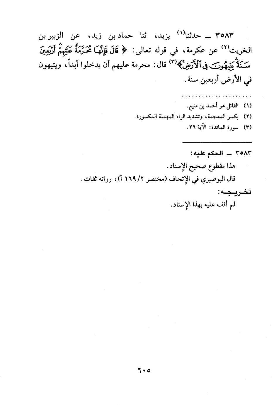 3583 - حدثنا يَزِيدُ، ثنا حَمَّادُ بْنُ زَيْدٍ، عَنْ الزبير بْنِ الْخِرِّيتِ عَنْ عِكْرِمَةَ، فِي قَوْلُهُ تَعَالَى: {قال §فَإِنَّهَا مُحَرَّمَةٌ عَلَيْهِمْ أَرْبَعِينَ سَنَةً يَتِيهُونَ فِي الْأَرْضِ} قَالَ: مُحَرَّمَةٌ عَلَيْهِمْ أَنْ يَدْخُلُوا أَبَدًا، ويتيهون فِي الْأَرْضِ أَرْبَعِينَ سَنَةً.