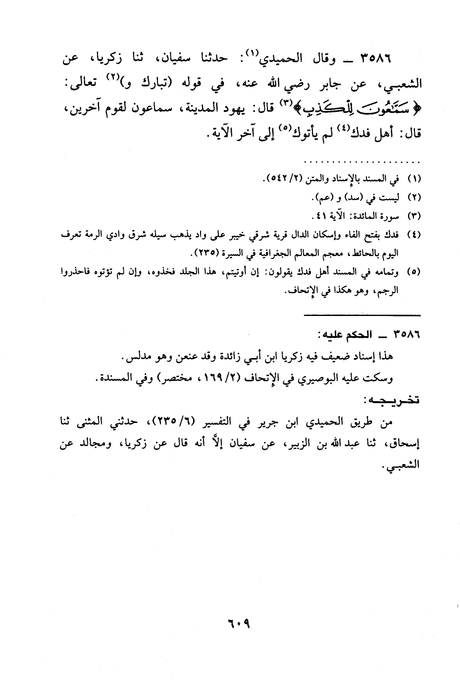 3586 - وَقَالَ الْحُمَيْدِيُّ: حدثنا سُفْيَانُ، ثنا زَكَرِيَّا، عَنِ الشَّعْبِيِّ، عَنْ جَابِرٍ رَضِيَ الله عَنْه، فِي قَوْلُهُ (تبارك و) تَعَالَى: {§سَمَّاعُونَ لِلْكَذِبِ} قَالَ: يَهُودُ الْمَدِينَةِ، سَمَّاعُونَ لِقَوْمٍ آخَرِينَ، قَالَ: أَهْلُ فَدَكَ لَمْ يَأْتُوكَ إِلَى آخِرِ الْآيَةِ.