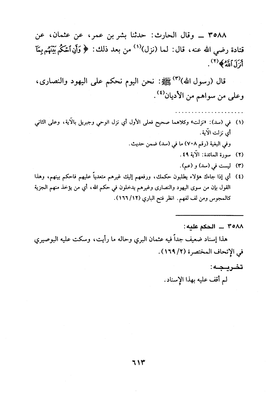 3588 - وَقَالَ الْحَارِثُ: حدثنا بِشْرُ بْنُ عُمَرَ، عَنْ عُثْمَانَ، عَنْ قَتَادَةَ رَضِيَ الله عَنْه، قَالَ: لَمَّا (نَزَلَ) مِنْ بَعْدِ ذَلِكَ: {وَأَنِ احْكُمْ بَيْنَهُمْ بِمَا أَنْزَلَ اللَّهُ} .