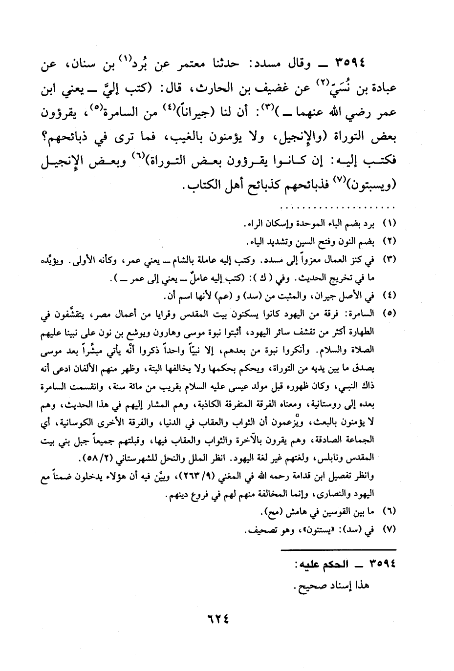 3594 - وَقَالَ مُسَدَّدٌ: حدثنا مُعْتَمِرٌ عَنْ بُرْدِ بْنِ سِنَانٍ، عَنْ عُبَادَةَ بْنِ نُسَيٍّ عَنْ غُضَيْفِ بْنِ الْحَارِثِ، قَالَ: (كَتَبَ إِلَى - يعني ابن عمر رَضِيَ الله عَنْهما -) : إِنَّ لَنَا (جِيرَانًا) مِنَ السَّامِرَةِ، يقرؤون بَعْضَ التَّوْرَاةِ (وَالْإِنْجِيلِ، §وَلَا يُؤْمِنُونَ بالغيب، فَمَا تَرَى فِي ذَبَائِحَهِمْ؟ فَكَتَبَ إِلَيْهِ: إِنْ كَانُوا يقرؤون بَعْضَ التَّوْرَاةِ) وبعض الْإِنْجِيلِ (وَيَسْبِتُونَ) فَذَبَائِحُهُمْ كَذَبَائِحِ أَهْلِ الْكِتَابِ.