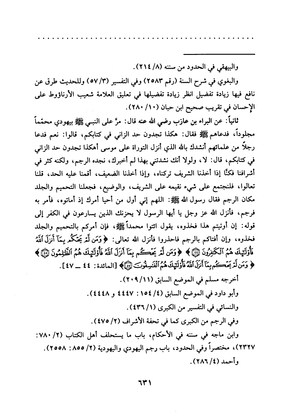 ثانيًا: عَنِ الْبَرَاءِ بْنِ عَازِبٍ رَضِيَ اللَّهُ عَنْهُ قَالَ: مرَّ عَلَى النَّبِيِّ -صَلَّى اللَّهُ عَلَيْهِ وَسَلَّمَ- بيهودي محمَّمًا مجلودًا، فدعاهم -صلى الله عليه وسلم- فقال: هكذا تجدون حد الزاني في كتابكم، قالوا: نعم فدعا رجلًا من علمائهم أنشدك بالله الذي أنزل التوراة على موسى أهكذا تجدون حد الزاني في كتابكم، قال: لا، ولولا أنك نشدتني بهذا لم أخبرك، نجده الرجم، ولكنه كثر في أشرافنا فكنَّا إذا أخذنا الشريف تركناه، وإذا أخذنا الضعيف، أقمنا عليه الحد، قلنا تعالوا، فلنجتمع على شيء نقيمه على الشريف، والوضيع، فجعلنا التحميم والجلد مكان الرجم فَقَالَ رَسُولُ اللَّهِ -صَلَّى اللَّهُ عَلَيْهِ وَسَلَّمَ-: اللهم إني أول من أحيا أمرك إذ أماتوه، فأمر به فرجم، فأنزل الله عَزَّ وَجَلَّ يا أيها الرسول لا يحزنك الذين يسارعون في الكفر إلى قوله: إن أوتيتم هذا فخذوه، يقول ائتوا محمدًا -صلى الله عليه وسلم-، فإن أمركم بالتحميم والجلد فخذوه، وإن أفتاكم بالرجم فاحذروا فأنزل الله تعالى: {وَمَنْ لَمْ يَحْكُمْ بِمَا أَنْزَلَ اللَّهُ فَأُولَئِكَ هُمُ الْكَافِرُونَ (44)} {وَمَنْ لَمْ يَحْكُمْ بِمَا أَنْزَلَ اللَّهُ فَأُولَئِكَ هُمُ الظَّالِمُونَ} {وَمَنْ لَمْ يَحْكُمْ بِمَا أَنْزَلَ اللَّهُ فَأُولَئِكَ هُمُ الْفَاسِقُونَ} [المائدة: 44 - 47].
