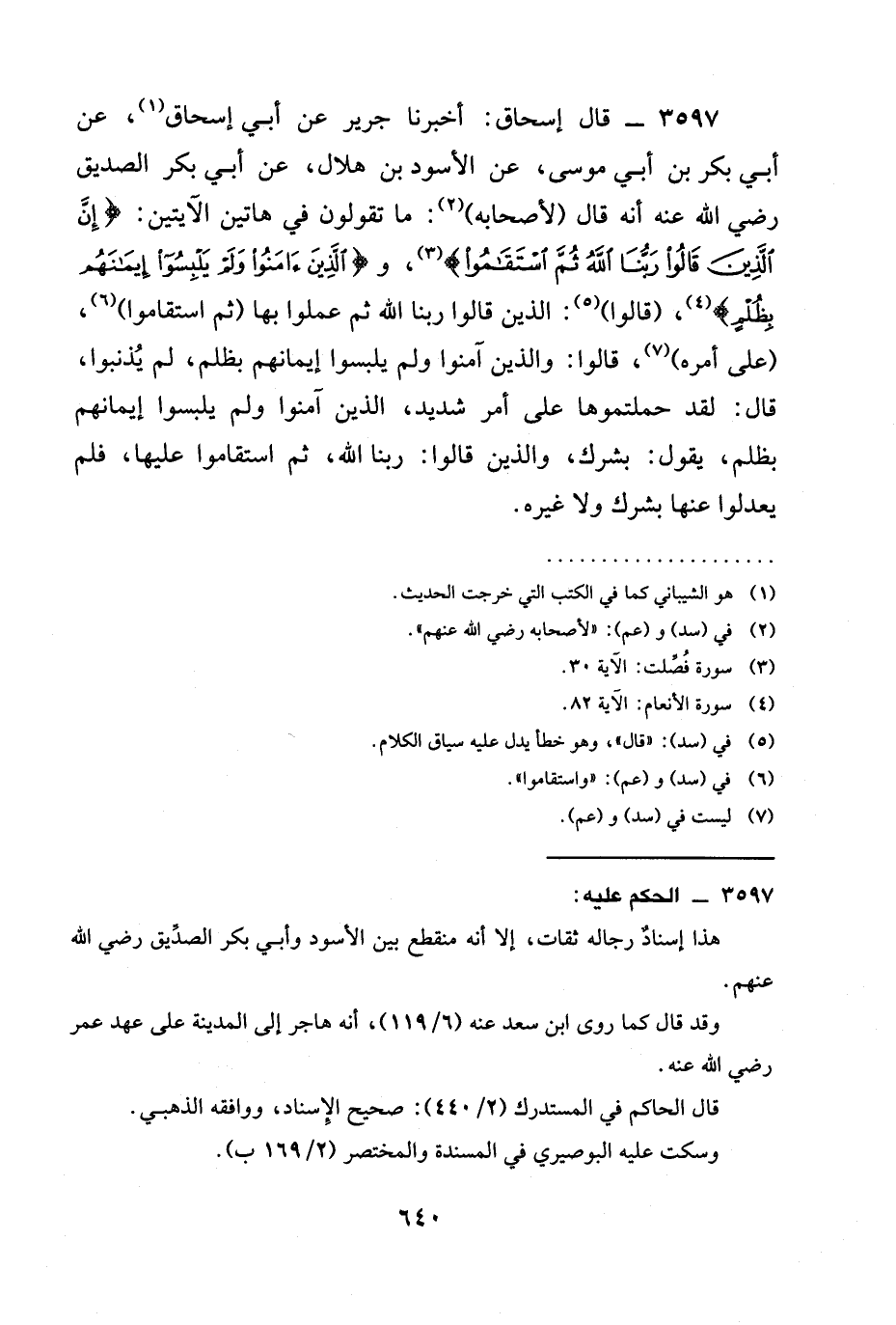 3597 - قَالَ إِسْحَاقُ: أَخْبَرَنَا جَرِيرٌ عَنْ أَبِي إِسْحَاقَ، عَنْ أَبِي بَكْرِ بْنِ أَبِي مُوسَى، عَنِ الْأَسْوَدِ بْنِ هِلَالٍ، عَنْ أَبِي بَكْرٍ الصِّدِّيقِ رَضِيَ الله عَنْه أَنَّهُ قَالَ (لِأَصْحَابِهِ) : مَا تَقُولُونَ فِي هَاتَيْنِ الْآيَتَيْنِ: {§إِنَّ الَّذِينَ قَالُوا رَبُّنَا اللَّهُ ثُمَّ اسْتَقَامُوا} ، وَ {الَّذِينَ آمَنُوا وَلَمْ يَلْبِسُوا إِيمَانَهُمْ بِظُلْمٍ} ، (قَالُوا) : الَّذِينَ قَالُوا رَبُّنَا اللَّهُ ثُمَّ عَمِلُوا بِهَا (ثم استقاموا) ، (عَلَى أَمْرِهِ) ، قَالُوا: وَالَّذِينَ آمَنُوا وَلَمْ يَلْبِسُوا إِيمَانَهُمْ بِظُلْمٍ، لَمْ يُذْنِبُوا، قَالَ: لَقَدْ حَمَلْتُمُوهَا عَلَى أَمْرٍ شَدِيدٍ، الَّذِينَ آمَنُوا وَلَمْ يَلْبِسُوا إِيمَانَهُمْ بِظُلْمٍ، يَقُولُ: بِشِرْكٍ، والذين قَالُوا: رَبُّنَا اللَّهُ، ثُمَّ اسْتَقَامُوا عَلَيْهَا، فَلَمْ يَعْدِلُوا عَنْهَا بِشِرْكٍ وَلَا غَيْرِهِ.