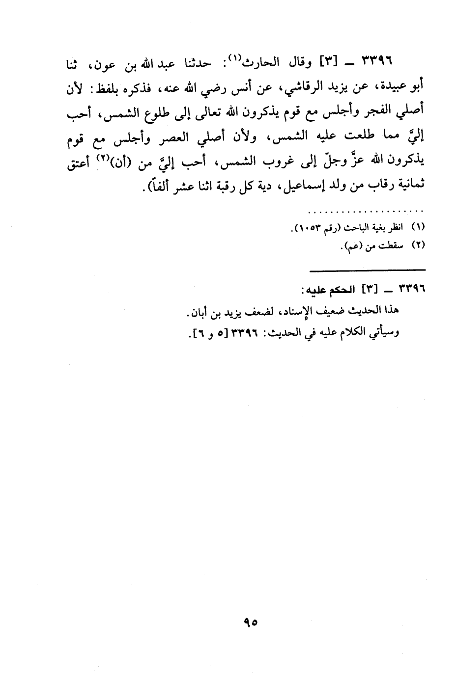 3396 -[3] وَقَالَ الْحَارِثُ: حَدَّثَنَا عَبْدُ اللَّهِ بْنُ عَوْنٍ، ثنا أَبُو عُبَيْدَةَ، عَنْ يَزِيدَ الرَّقَاشِيِّ، عَنْ أَنَسٍ رَضِيَ الله عَنْهُ، فَذَكَرَهُ بِلَفْظِ: §لَأَنْ أُصَلِّيَ الْفَجْرَ وَأَجْلِسَ مَعَ قَوْمٍ يَذْكُرُونَ اللَّهَ تَعَالَى إِلَى طُلُوعِ الشَّمْسِ، أَحَبُّ إِلَيَّ مِمَّا طَلَعَتْ عَلَيْهِ الشَّمْسُ، وَلَأَنْ أُصَلِّيَ الْعَصْرَ وَأَجْلِسَ مَعَ قَوْمٍ يذكرون الله عز وجل إِلَى غُرُوبِ الشَّمْسِ، أَحَبُّ إِلَيَّ مِنْ (أَنْ) أُعْتِقَ ثَمَانِيَةَ رِقَابٍ مِنْ وَلَدِ إِسْمَاعِيلَ، دِيَةُ كُلِّ رَقَبَةٍ اثْنَا عَشَرَ أَلْفًا) .