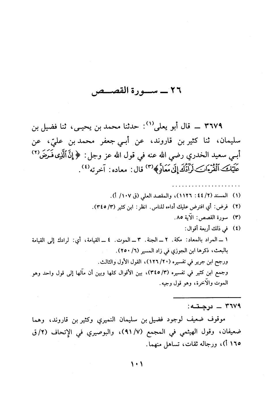 3679 - قَالَ أَبُو يَعْلَى: حدثنا مُحَمَّدُ بْنُ يَحْيَى، ثنا فُضَيْلُ بْنُ سُلَيْمَانَ، ثنا كَثِيرُ بْنُ قاروند، عَنْ أَبِي جَعْفَرِ مُحَمَّدِ بْنِ عَلِيٍّ، عَنْ أَبِي سَعِيدٍ الْخُدْرِيِّ رَضِيَ الله عَنْه فِي قَوْلِ اللَّهِ عَزَّ وَجَلَّ: {§إِنَّ الَّذِي فَرَضَ عَلَيْكَ الْقُرْءَانَ لَرَادُّكَ إِلَى مَعَادٍ} قَالَ: مَعَادُهُ: آخِرَتُهُ.