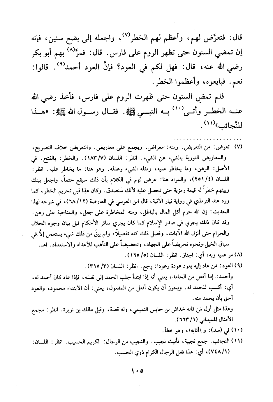 قَالَ: فتعرَّض لَهُمْ، وَأَعْظِمْ لَهُمُ الْخَطَرَ (¬7)، وَاجْعَلْهُ إلى بضع سنين، فإنه إن تَمْضِيَ السِّنُونُ حَتَّى تَظْهَرَ الرُّومُ عَلَى فَارِسَ. قال: فمرَّ (¬8) بهم أبو بكر رضي الله عنه، قَالَ: فَهَلْ لَكُمْ فِي الْعَوْدِ؛ فإنَّ الْعَوْدَ أَحْمَدُ (¬9). قَالُوا: نَعَمْ. فَبَايَعُوهُ، وَأَعْظَمُوا الْخَطَرَ.
