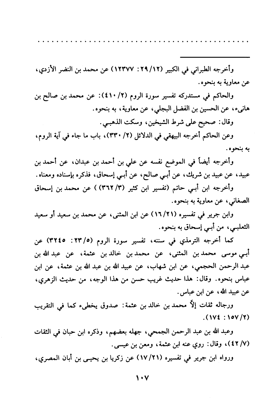 والحاكم في مستدركه تفسير سورة الروم (2/ 410): عن محمد بن صالح بن هانئ، عن الحسين بن الفضل البجلي، عن معاوية، به بنحوه.