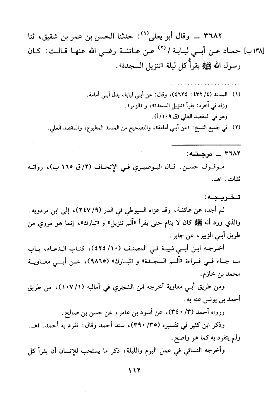 3682 - وَقَالَ أَبُو يَعْلَى: حدثنا الْحَسَنُ بْنُ عُمَرَ بْنِ شَقِيقٍ، ثنا حَمَّادٌ عَنْ أَبِي لُبَابَةَ عَنْ عَائِشَةَ رَضِيَ الله عَنْها قَالَتْ: كَانَ رَسُولُ اللَّهِ صَلَّى اللَّهُ عَلَيْهِ وَسَلَّمَ §يَقْرَأُ كُلَّ لَيْلَةٍ " تَنْزِيلُ السَّجْدَةَ ".