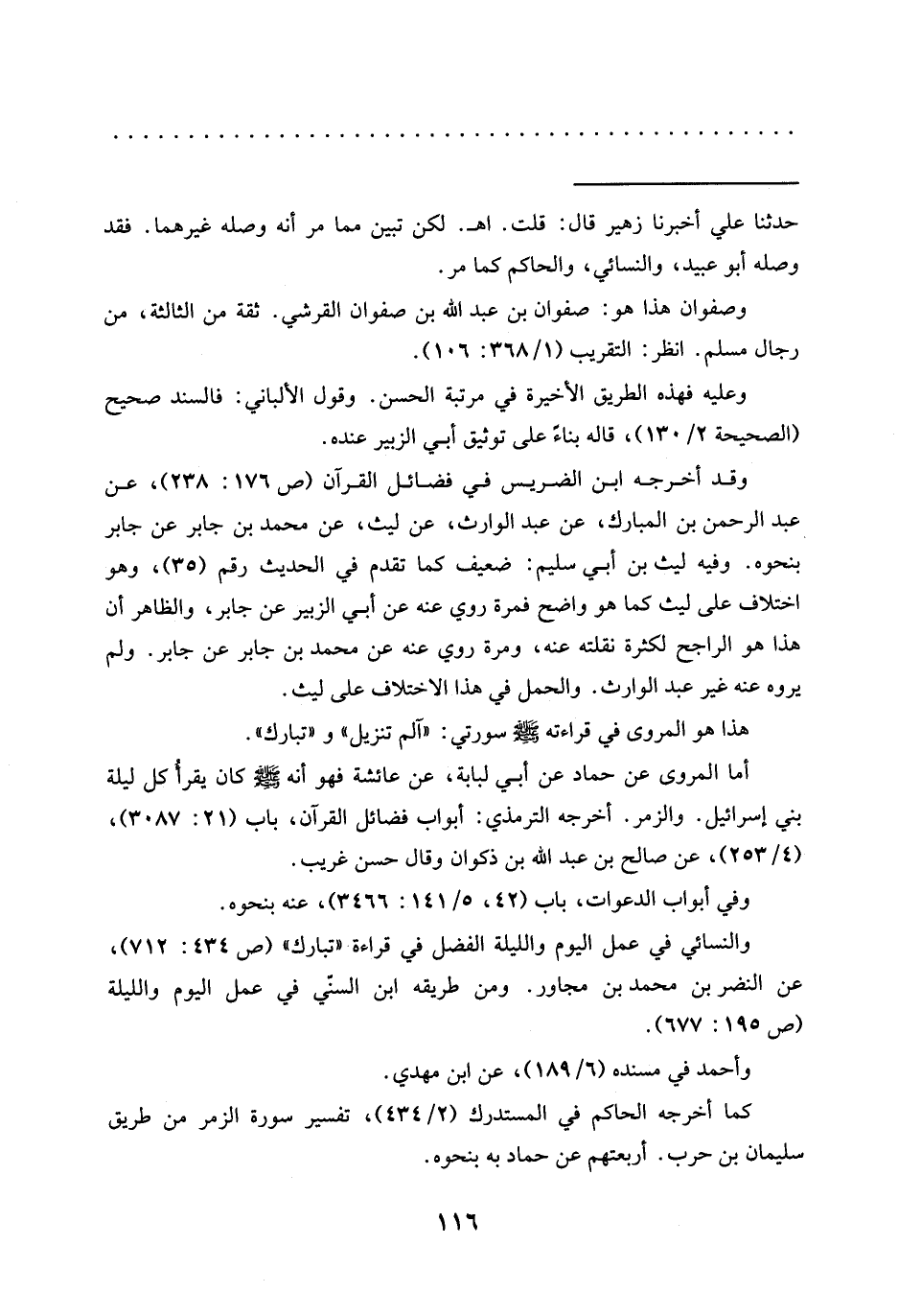 وقد أخرجه ابن الضريس في فضائل القرآن (ص 176: 238)، عن عبد الرحمن بن المبارك، عن عبد الوارث، عن ليث، عن محمد بن جابر عن جابر بنحوه. وفيه ليث بن أبي سليم: ضعيف كما تقدم في الحديث رقم (35)، وهو اختلاف على ليث كما هو واضح فمرة روي عنه عن أبي الزبير عن جابر، والظاهر أن هذا هو الراجح لكثرة نقلته عنه، ومرة روي عنه عن محمد بن جابر عن جابر. ولم يروه عنه غير عبد الوارث. والحمل في هذا الاختلاف على ليث.