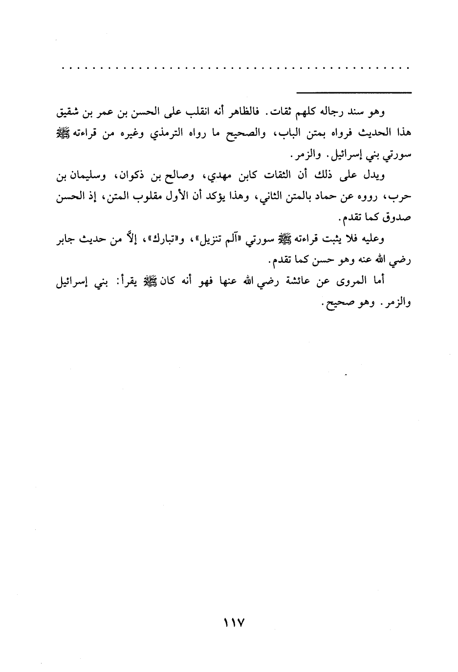 = وهو سند رجاله كلهم ثقات. فالظاهر أنه انقلب على الحسن بن عمر بن شقيق هذا الحديث فرواه بمتن الباب، والصحيح ما رواه الترمذي وغيره من قراءته -صلى الله عليه وسلم- سورتي بني إسرائيل. والزمر.
