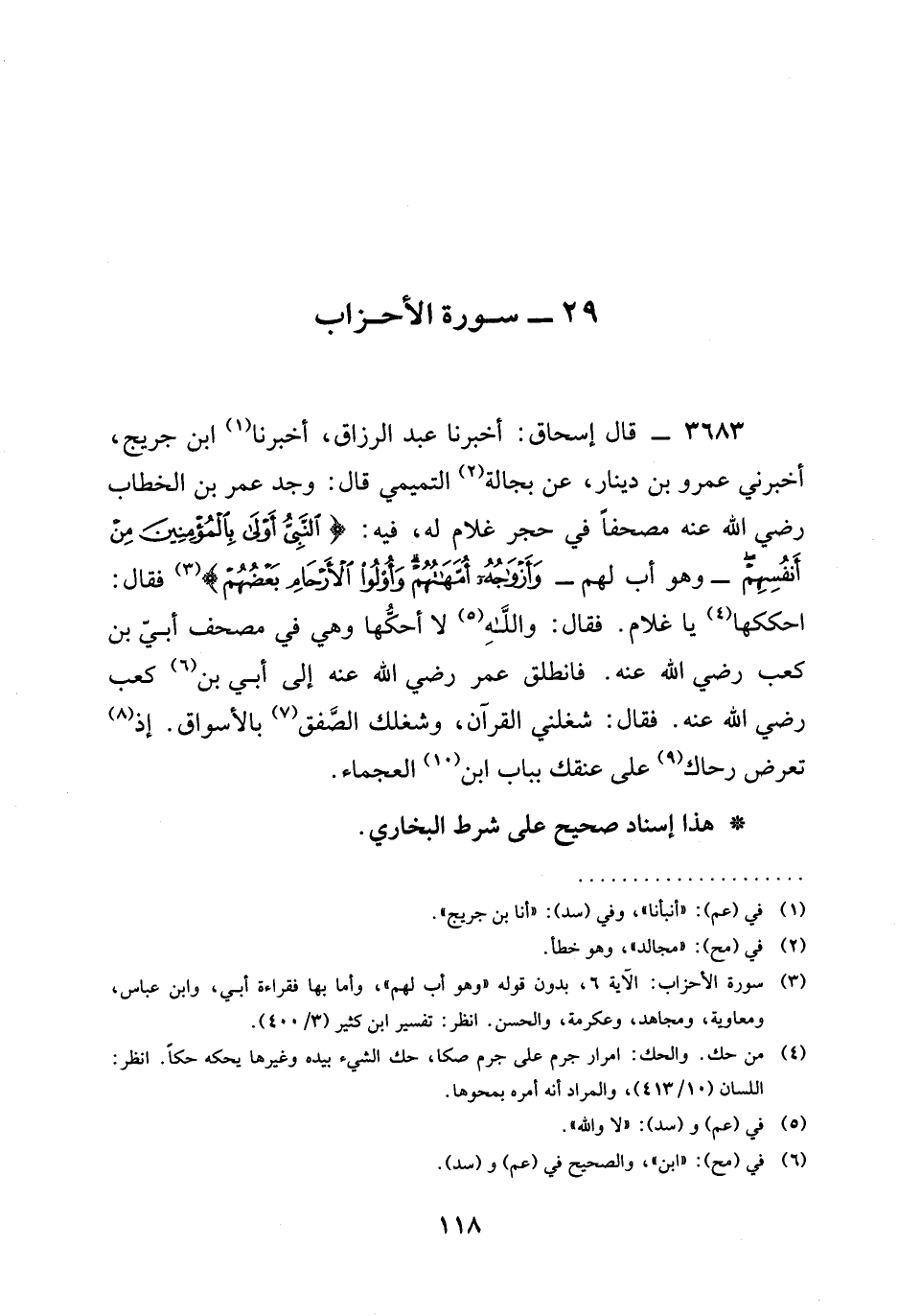 3683 - قَالَ إِسْحَاقُ: أخبرنا عَبْدُ الرَّزَّاقِ، أخبرنا ابْنُ جُرَيْجٍ، أَخْبَرَنِي عَمْرُو بْنُ دِينَارٍ، عَنْ بَجَالَةَ التَّمِيمِيِّ قَالَ: §وَجَدَ عُمَرُ بْنُ الْخَطَّابِ رَضِيَ الله عَنْه مُصْحَفًا فِي حِجْرِ غُلَامٍ لَهُ، فِيهِ: {النَّبِيُّ أَوْلَى بِالْمُؤْمِنِينَ مِنْ أَنْفُسِهِمْ} - وَهُوَ أَبٌ لَهُمْ - {وَأَزْوَاجُهُ أُمَّهَاتُهُمْ وَأُوْلُواْ الأَرْحَامِ بَعْضُهُمْ} فَقَالَ: احْكُكْهَا يَا غُلَامُ. فَقَالَ: وَاللَّهِ لَا أَحُكُّهَا وَهِيَ فِي مُصْحَفِ أُبَيِّ بْنِ كَعْبٍ رَضِيَ الله عَنْه. فَانْطَلَقُ عُمَرُ رَضِيَ الله عَنْه إِلَى أُبَيِّ بْنِ كَعْبٍ رَضِيَ الله عَنْه. فَقَالَ: شَغَلَنِي الْقُرْآنُ، وَشَغَلَكَ الصَّفْقُ بِالْأَسْوَاقِ. إذ تَعْرِضَ رَحَاكَ عَلَى عُنُقِكَ بِبَابِ ابْنِ الْعَجْمَاءِ.