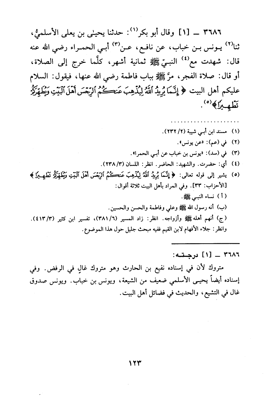 3686 -[1] وَقَالَ أَبُو بَكْرِ: حدثنا يَحْيَى بْنُ يَعْلَى الْأَسْلَمِيُّ، ثنا يُونُسُ بْنُ خَبَّابٍ، عَنْ نَافِعٍ، عَنْ أَبِي الْحَمْرَاءِ رَضِيَ الله عَنْه قَالَ: شَهِدْتُ مَعَ النَّبِيِّ صَلَّى اللَّهُ عَلَيْهِ وَسَلَّمَ ثَمَانِيَةَ أَشْهُرٍ، كُلَّمَا خَرَجَ إِلَى الصَّلَاةِ، أَوْ قَالَ: صَلَاةِ الْفَجْرِ، مَرَّ صَلَّى اللَّهُ عَلَيْهِ وَسَلَّمَ بِبَابِ فَاطِمَةَ رَضِيَ الله عَنْها، فَيَقُولُ: §السَّلَامُ عَلَيْكُمْ أَهْلَ الْبَيْتِ {إِنَّمَا يُرِيدُ اللَّهُ لِيُذْهِبَ عَنْكُمُ الرِّجْسَ أَهْلَ الْبَيْتِ وَيُطَهِّرَكُمْ تَطْهِيرًا} .