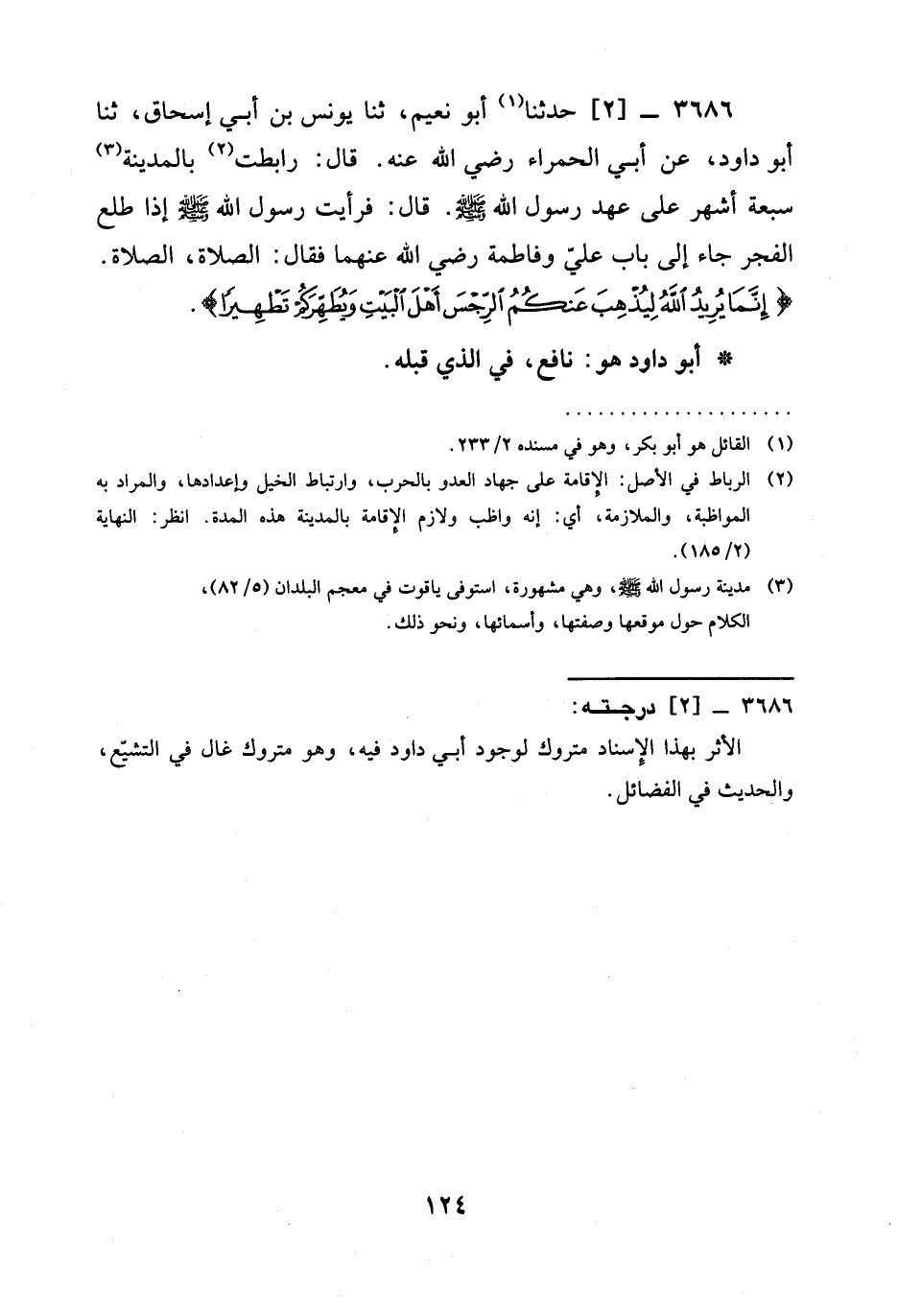 3686 -[2] حدثنا أَبُو نُعَيْمٍ، ثنا يُونُسُ بْنُ أَبِي إِسْحَاقَ، ثنا أَبُو دَاوُدَ، عَنْ أَبِي الْحَمْرَاءِ رَضِيَ الله عَنْه. قَالَ: رَابَطْتُ بِالْمَدِينَةِ سَبْعَةَ أَشْهُرٍ عَلَى عَهْدِ رَسُولِ اللَّهِ صَلَّى اللَّهُ عَلَيْهِ وَسَلَّمَ. قَالَ: فَرَأَيْتُ رَسُولَ اللَّهِ صَلَّى اللَّهُ عَلَيْهِ وَسَلَّمَ §إِذَا طَلَعَ الْفَجْرُ جَاءَ إِلَى بَابِ عَلِيٍّ وَفَاطِمَةَ رَضِيَ الله عَنْهما فَقَالَ: الصَّلَاةَ، الصَّلَاةَ. {إِنَّمَا يُرِيدُ اللَّهُ لِيُذْهِبَ عَنْكُمُ الرِّجْسَ أَهْلَ الْبَيْتِ وَيُطَهِّرَكُمْ تَطْهِيرًا} .