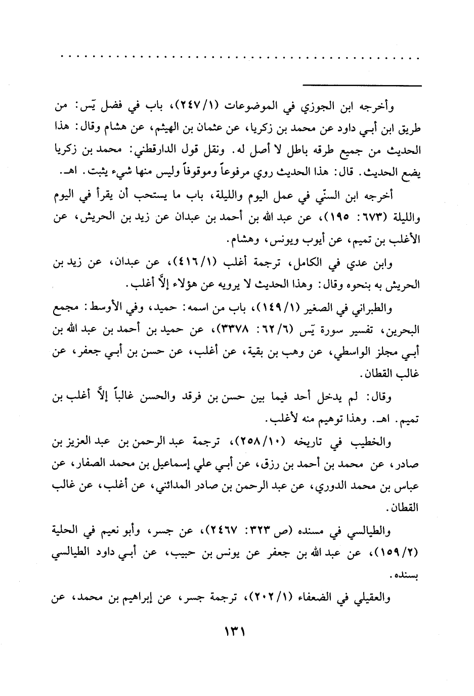 أَخْرَجَهُ ابْنُ السُّنِّيِّ فِي عَمَلِ الْيَوْمِ وَاللَّيْلَةِ، باب ما يستحب أن يقرأ في اليوم والليلة (673: 195)، عن عبد الله بن أحمد بن عبدان عن زيد بن الحريش، عن الأغلب بن تميم، عن أيوب ويونس، وهشام.