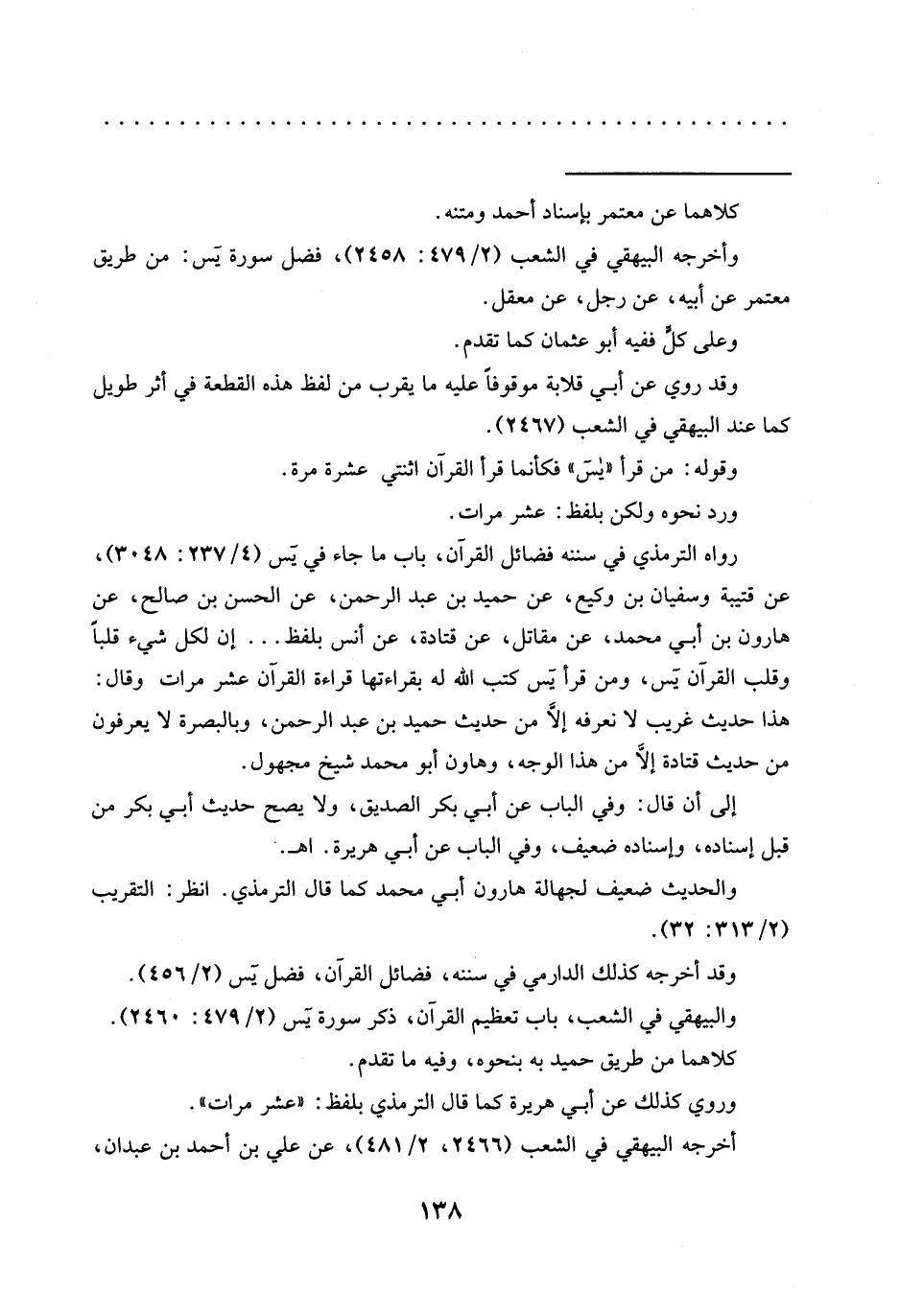 رواه الترمذي في سننه فضائل القرآن، باب ما جاء في يس (4/ 237: 3048)، عن قتيبة وسفيان بن وكيع، عن حُمَيْدُ بْنُ عَبْدِ الرَّحْمَنِ، عَنِ الْحَسَنِ بْنِ صالح، عن هارون بن أبي محمد، عن مقاتل، عن قتادة، عن أنس بلفظ ... إن لكل شيء قلبًا وقلب القرآن يس، ومن قرأ يس كتب الله له بقراءتها قراءة القرآن عشر مرات وقال: هذا حديث غريب لا نعرفه إلَّا من حديث حميد بن عبد الرحمن، وبالبصرة لا يعرفون من حديث قتادة إلَّا من هذا الوجه، وهاون أبو محمد شيخ مجهول.