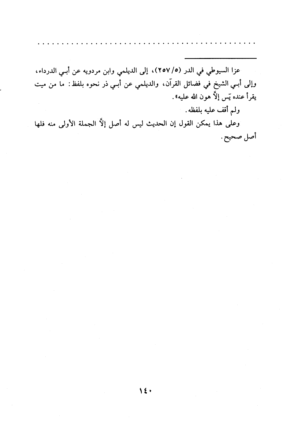 = عزا السيوطي في الدر (5/ 257)، إلى الديلمي وابن مردويه عن أبي الدرداء، وإلى أبي الشيخ في فضائل القرآن، والديلمي عن أبي ذر نحوه بلفظ: ما من ميت يقرأ عنده يس إلَّا هون الله عليه".