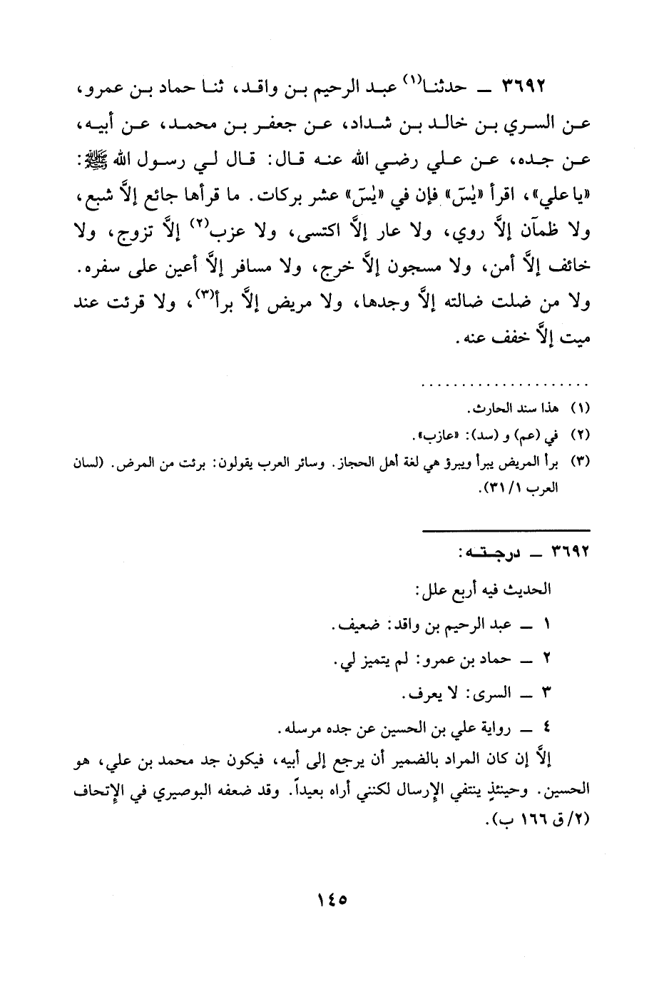 3692 - حَدَّثَنَا عَبْدُ الرَّحِيمِ بْنُ وَاقِدٍ، ثنا حَمَّادُ بْنُ عَمْرٍو، عَنِ السَّرِيِّ بْنِ خَالِدِ بْنِ شَدَّادٍ، عَنْ جَعْفَرِ بْنِ مُحَمَّدٍ، عَنْ أَبِيهِ، عَنْ جَدِّهِ، عَنْ عَلِيٍّ رَضِيَ الله عَنْه قَالَ: قَالَ لِي رَسُولُ اللَّهِ صَلَّى اللَّهُ عَلَيْهِ وَسَلَّمَ: " يَا عَلِيُّ "، §اقْرَأْ " يس " فَإِنَّ فِي " يس " عَشْرَ بَرَكَاتٍ. مَا قَرَأَهَا جَائِعٌ إِلَّا شَبِعَ، وَلَا ظَمْآنُ، إِلَّا رَوِيَ، وَلَا عَارٍ إِلَّا اكْتَسَى، وَلَا عَزَبٌ إِلَّا تَزَوَّجَ، وَلَا خَائِفٌ إِلَّا أَمِنَ، وَلَا مَسْجُونٌ إِلَّا خَرَجَ، وَلَا مُسَافِرٌ إِلَّا أُعِينَ عَلَى سَفَرِهِ. وَلَا مَنْ ضَلَّتْ ضَالَّتَهُ إِلَّا وَجَدَهَا، وَلَا مَرِيضٌ إِلَّا برأ، وَلَا قُرِئَتْ عِنْدَ مَيِّتٍ إِلَّا خُفِّفَ عَنْهُ.