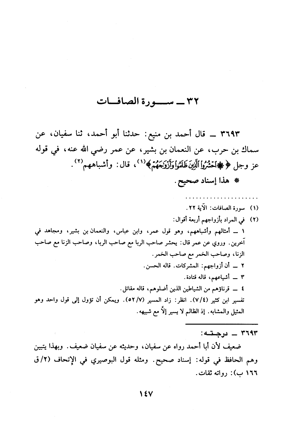 3693 - قَالَ أَحْمَدُ بْنُ مَنِيعٍ: حدثنا أَبُو أَحْمَدَ، ثنا سُفْيَانُ، عَنْ سِمَاكِ بْنِ حَرْبٍ، عَنِ النُّعْمَانِ بْنِ بَشِيرٍ، عَنْ عُمَرَ رَضِيَ الله عَنْه، فِي قَوْلِهِ عز وجل {§احْشُرُوا الَّذِينَ ظَلَمُوا وَأَزْوَاجَهُمْ} ، قَالَ: وَأَشْبَاهَهُمْ.