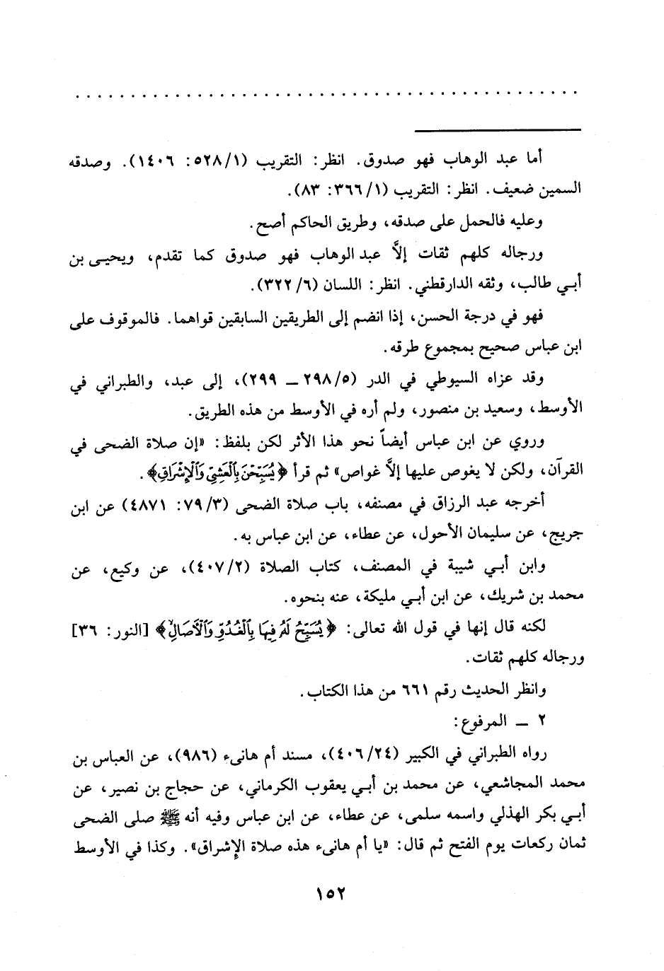 وروي عن ابن عباس أيضًا نحو هذا الأثر لكن بلفظ: "إن صلاة الضحى في القرآن، ولكن لا يغوص عليها إلَّا غواص" ثم قرأ {يُسَبِّحْنَ بِالْعَشِيِّ وَالْإِشْرَاقِ}.