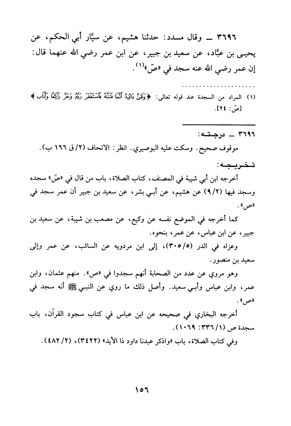 3696 - وَقَالَ مُسَدَّدٌ: حدثنا هُشَيْمٌ، عَنْ سَيَّارٍ أَبِي الْحَكَمِ، عَنْ يَحْيَى بْنِ عَبَّادٍ، عَنْ سَعِيدِ بْنِ جُبَيْرٍ، عَنِ ابن §عمر رَضِيَ الله عَنْهما قَالَ: إِنَّ عُمَرَ رَضِيَ الله عَنْه سَجَدَ فِي " ص ".