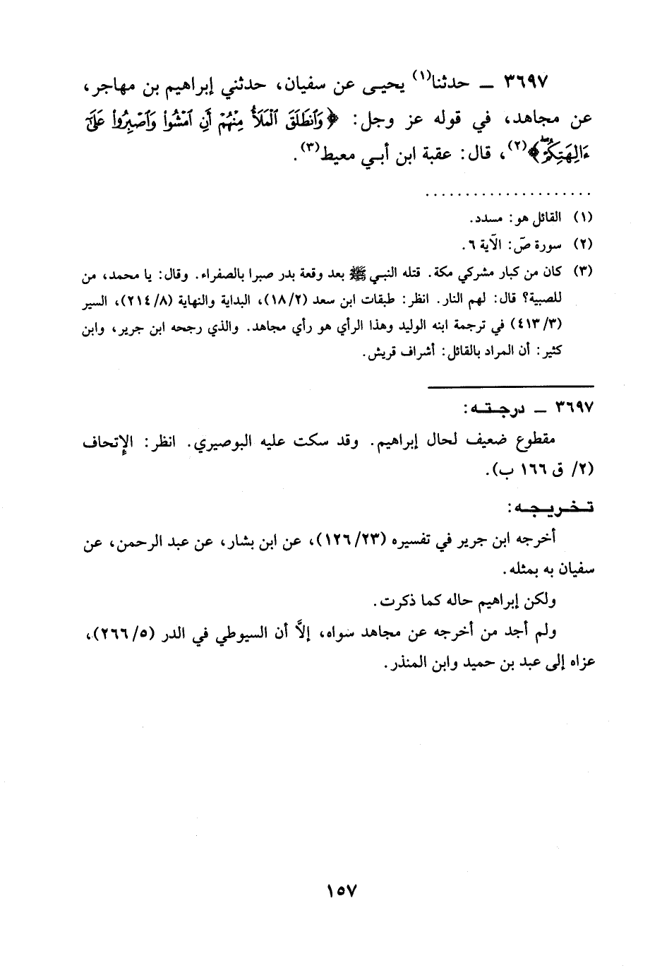 3697 - حدثنا يَحْيَى عَنْ سُفْيَانَ، حَدَّثَنِي إِبْرَاهِيمُ بْنُ مُهَاجِرٍ، عَنْ مُجَاهِدٍ، فِي قَوْلِهِ عَزَّ وَجَلَّ: {§وَانْطَلَقَ الْمَلَأُ مِنْهُمْ أَنِ امْشُوا وَاصْبِرُوا عَلَىءَالِهَتِكُمْ} ، قَالَ: عُقْبَةُ ابن أَبِي مُعَيْطٍ.