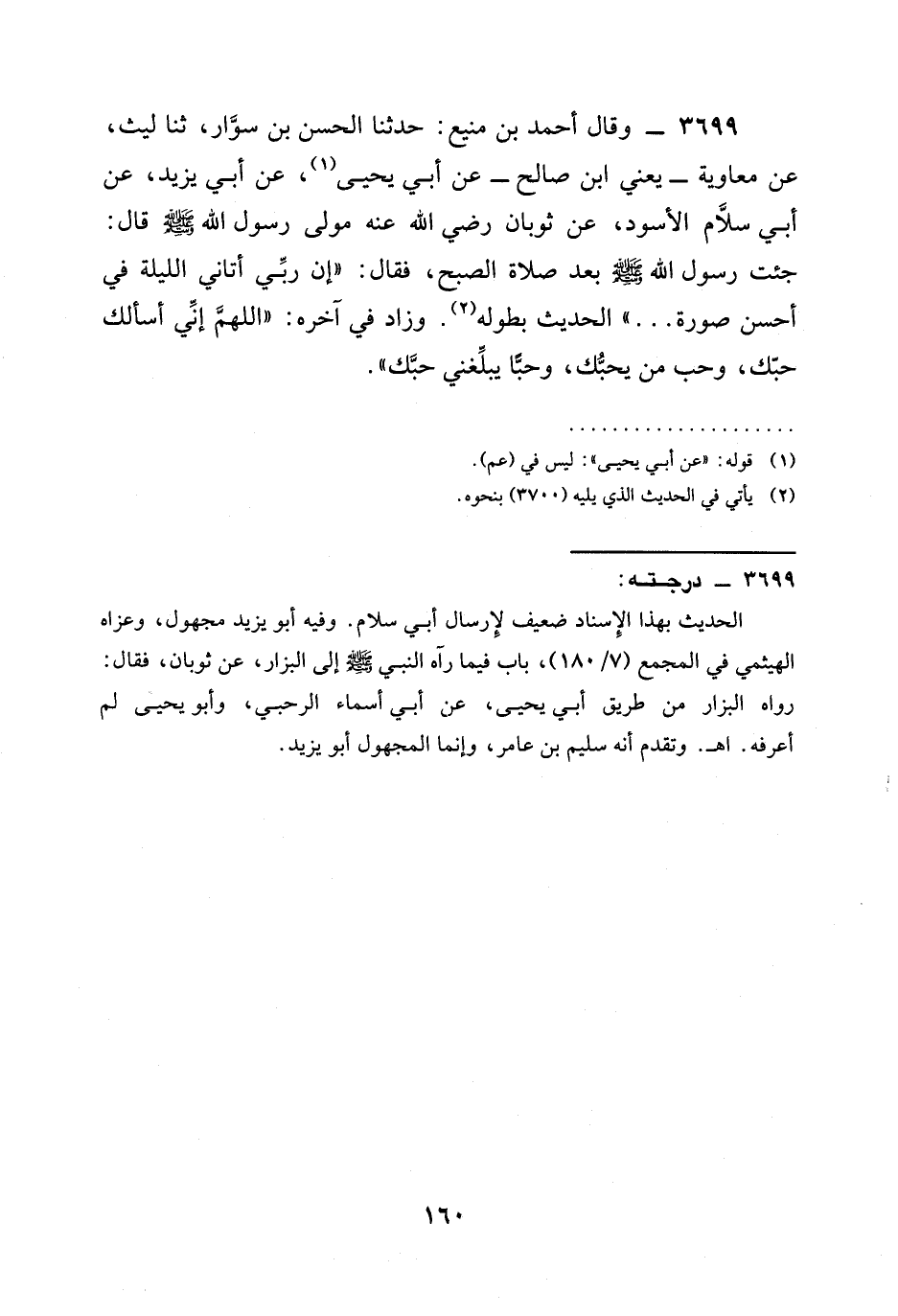 3699 - وَقَالَ أَحْمَدُ بْنُ مَنِيعٍ: حدثنا الْحَسَنُ بْنُ سَوَّارٍ، ثنا لَيْثٌ، عَنْ مُعَاوِيَةَ - يَعْنِي ابْنَ صَالِحٍ - عَنْ أَبِي يَحْيَى، عَنْ أَبِي يَزِيدَ، عَنْ أَبِي سَلَّامٍ الْأَسْوَدِ، عَنْ ثَوْبَانَ رَضِيَ الله عَنْه مَوْلَى رَسُولِ اللَّهِ صَلَّى اللَّهُ عَلَيْهِ وَسَلَّمَ قَالَ: جِئْتُ رَسُولَ اللَّهِ صَلَّى اللَّهُ عَلَيْهِ وَسَلَّمَ بَعْدَ صَلَاةِ الصُّبْحِ، فَقَالَ: " إِنَّ رَبِّي أَتَانِي اللَّيْلَةَ فِي أَحْسَنِ صُورَةٍ ... " الْحَدِيثَ بِطُولِهِ. وَزَادَ فِي آخِرِهِ: " §اللَّهُمَّ إِنِّي أَسْأَلُكَ حُبَّكَ، وَحُبَّ مَنْ يُحِبُّكَ، وَحُبًّا يُبَلِّغَنِي حُبَّكَ ".