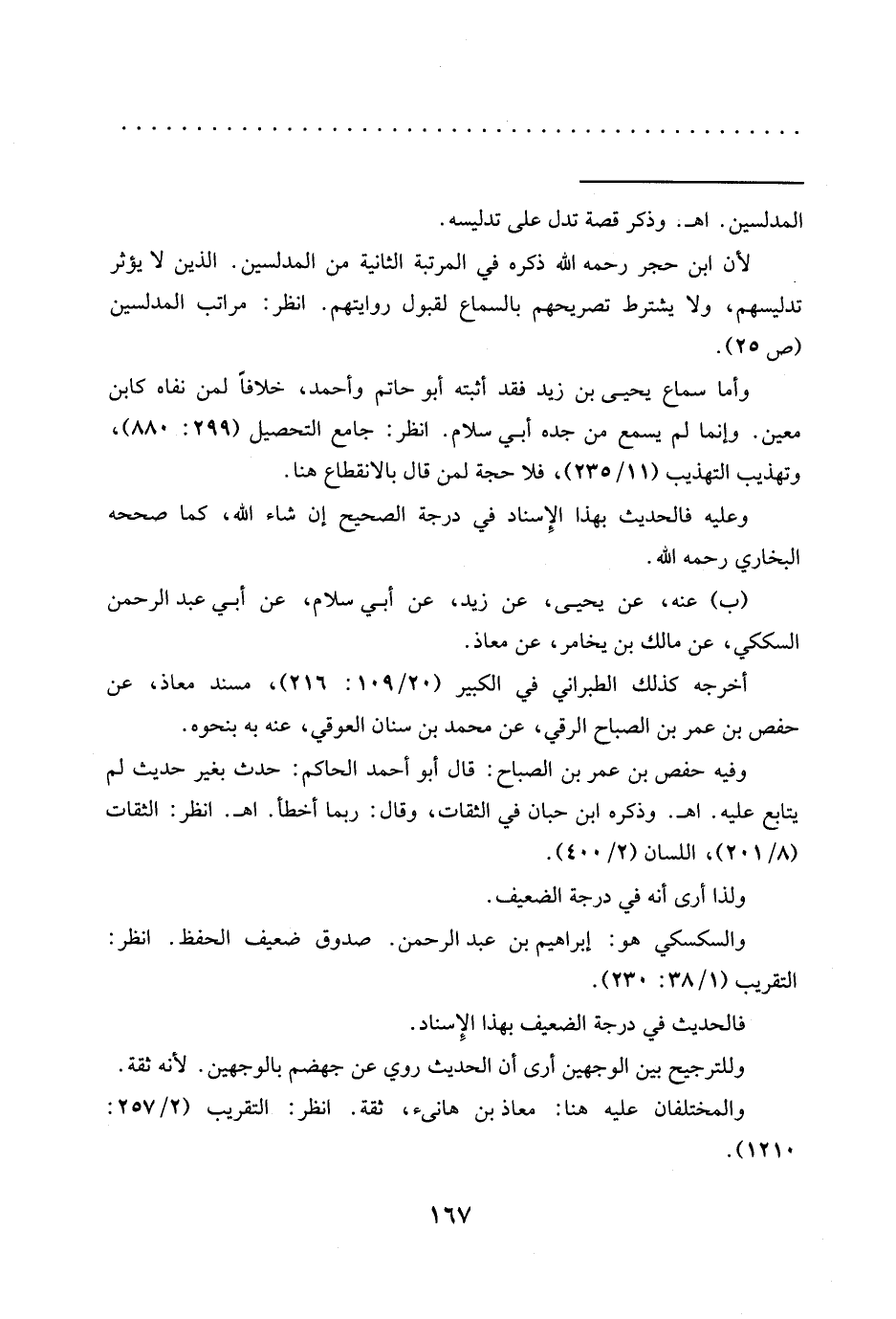 وأما سماع يحيى بن زيد فقد أثبته أبو حاتم وأحمد، خلافًا لمن نفاه كابن معين. وإنما لم يسمع من جده أبي سلام. انظر: جامع التحصيل (299: 880)، وتهذيب التهذيب (11/ 235)، فلا حجة لمن قال بالانقطاع هنا.