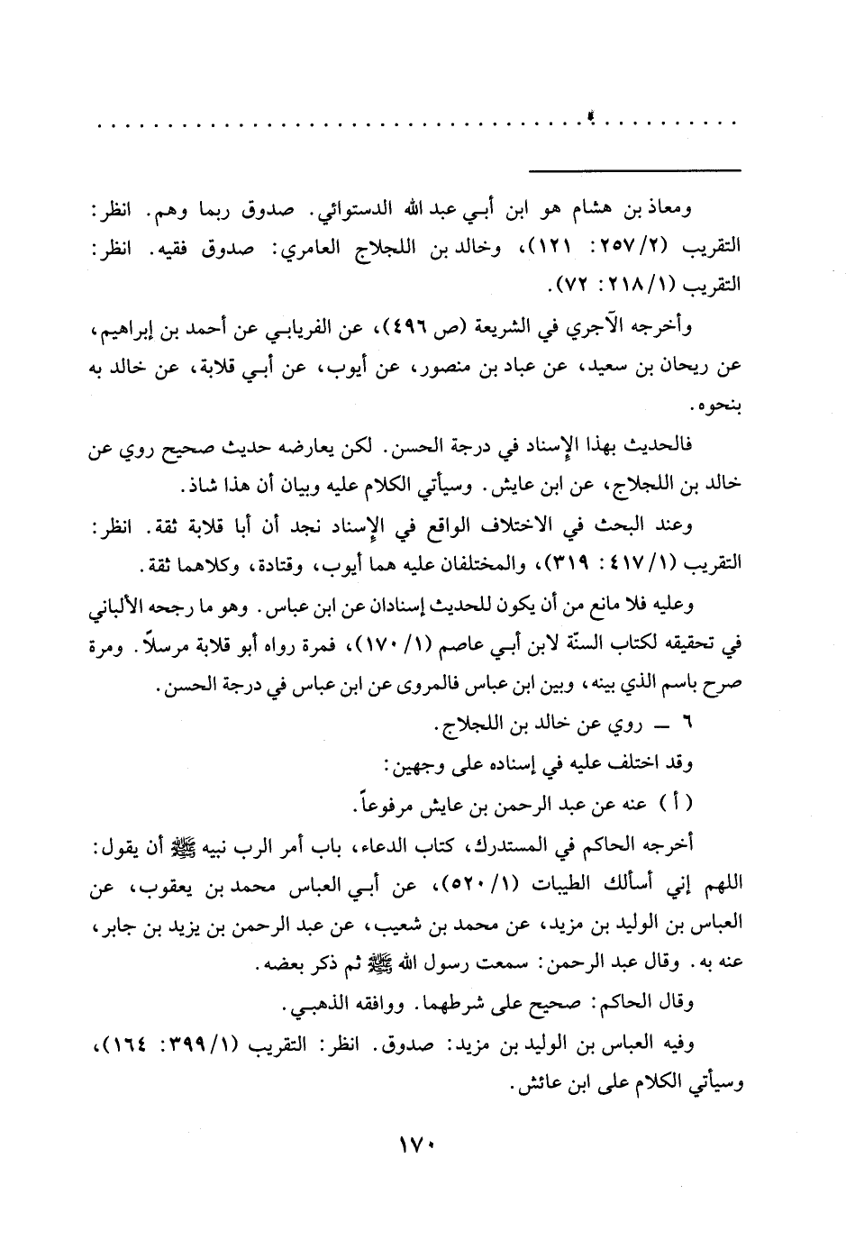 وعليه فلا مانع من أن يكون للحديث إسنادان عن ابن عباس. وهو ما رجحه الألباني في تحقيقه لكتاب السنّة لابن أبي عاصم (1/ 170)، فمرة رواه أبو قلابة مرسلًا. ومرة صرح باسم الذي بينه، وبين ابن عباس فالمروى عن ابن عباس في درجة الحسن.