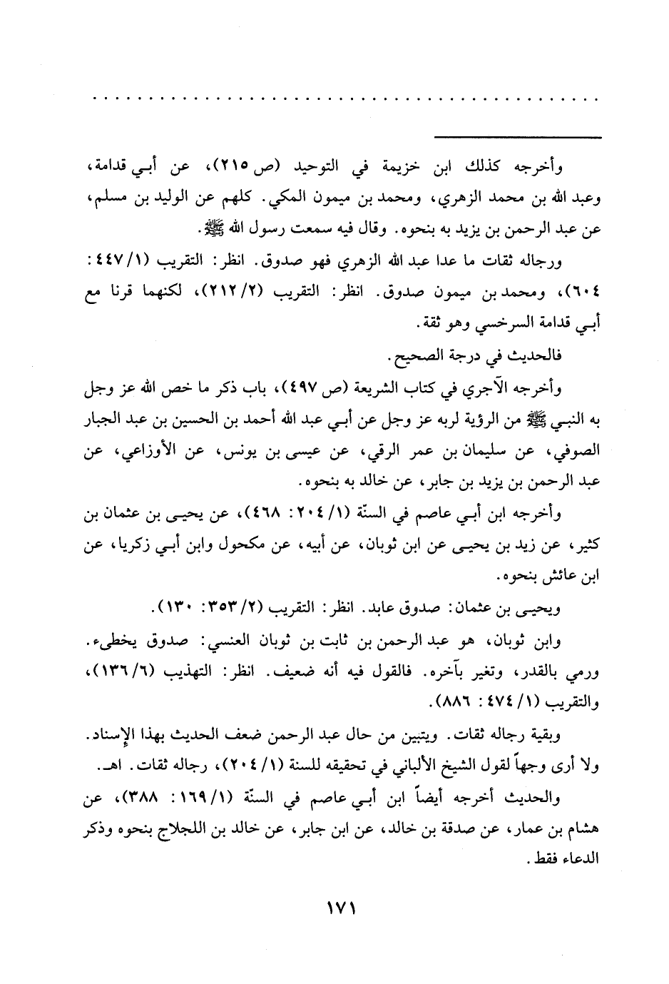 وأخرجه الآجري في كتاب الشريعة (ص 497)، باب ذكر ما خص الله عزَّ وجلّ بِهِ النَّبِيَّ -صَلَّى اللَّهُ عَلَيْهِ وَسَلَّمَ- مَنْ الرؤية لربه عَزَّ وَجَلَّ عن أبي عبد الله أحمد بن الحسين بن عبد الجبار الصوفي، عن سليمان بن عمر الرقي، عن عيسى بن يونس، عن الأوزاعي، عَنْ عَبْدِ الرَّحْمَنِ بْنِ يَزِيدَ بْنِ جَابِرٍ، عَنْ خالد به بنحوه.