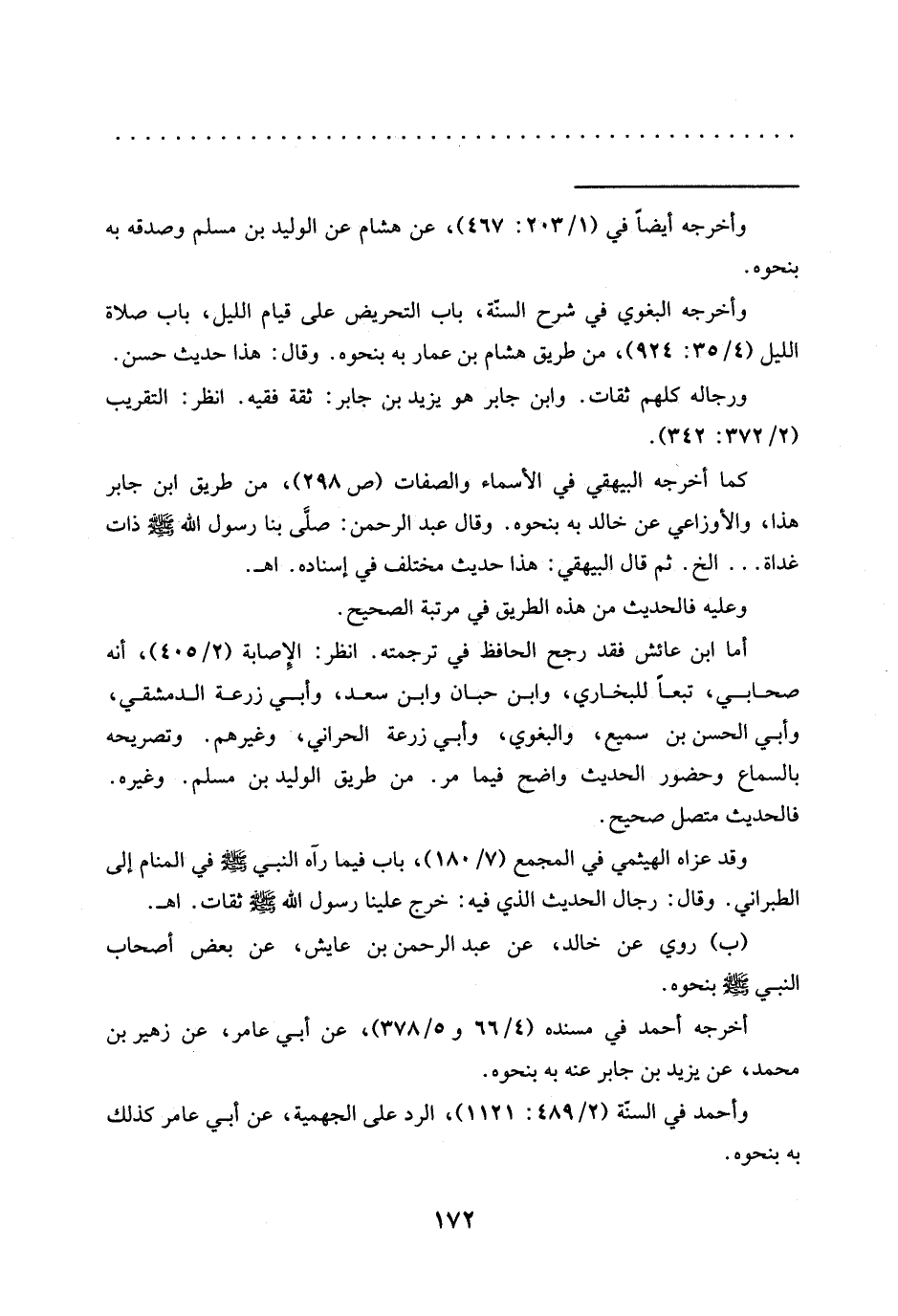 كما أخرجه البيهقي في الأسماء والصفات (ص 298)، من طريق ابن جابر هذا، والأوزاعي عن خالد به بنحوه. وقال عبد الرحمن: صلَّى بِنَا رَسُولُ اللَّهِ -صَلَّى اللَّهُ عَلَيْهِ وسلم- ذات غداة ... الخ. ثم قال البيهقي: هذا حديث مختلف في إسناده. اهـ.