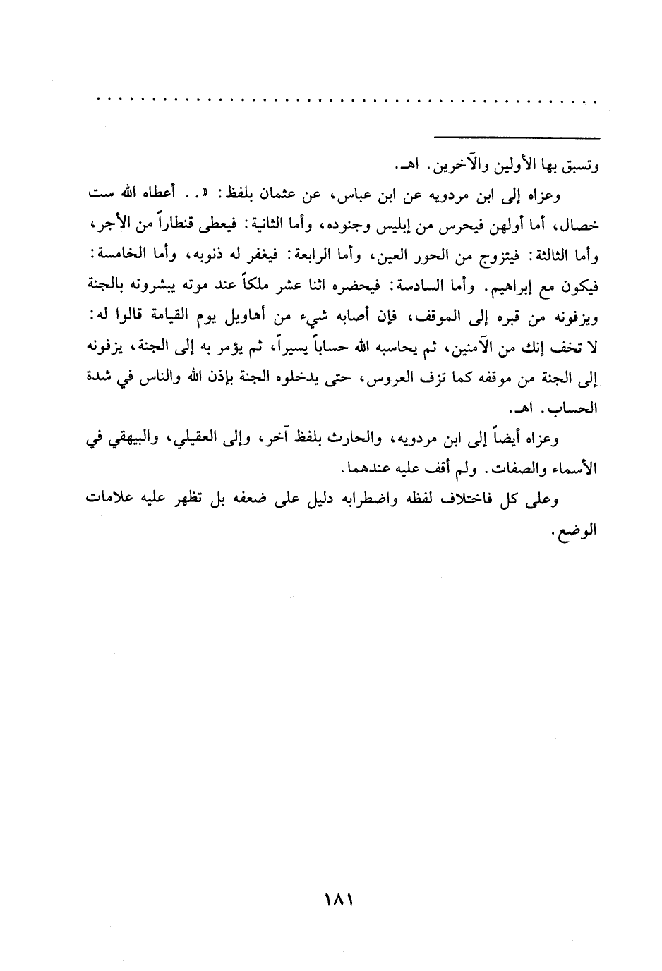 وعزاه إلى ابن مردويه عن ابن عباس، عن عثمان بلفظ: " .. أعطاه الله ست خِصَالٍ، أَمَّا أَوَّلُهُنَّ فَيُحْرَسُ مِنْ إِبْلِيسَ وَجُنُودِهِ، وَأَمَّا الثَّانِيَةُ: فَيُعْطَى قِنْطَارًا مِنَ الْأَجْرِ، وَأَمَّا الثالثة: فيتزوج من الحور العين، وأما الرابعة: فيغفر له ذنوبه، وأما الخامسة: فيكون مع إبراهيم. وأما السادسة: فيحضره اثنا عشر ملكًا عند موته يبشرونه بالجنة ويزفونه من قبره إلى الموقف، فإن أصابه شيء من أهاويل يوم القيامة قالوا له: لا تخف إنك من الآمنين، ثم يحاسبه الله حسابًا يسيرًا، ثم يؤمر به إلى الجنة، يزفونه إلى الجنة من موقفه كما تزف العروس، حتى يدخلوه الجنة بإذن الله والناس في شدة الحساب. اهـ.