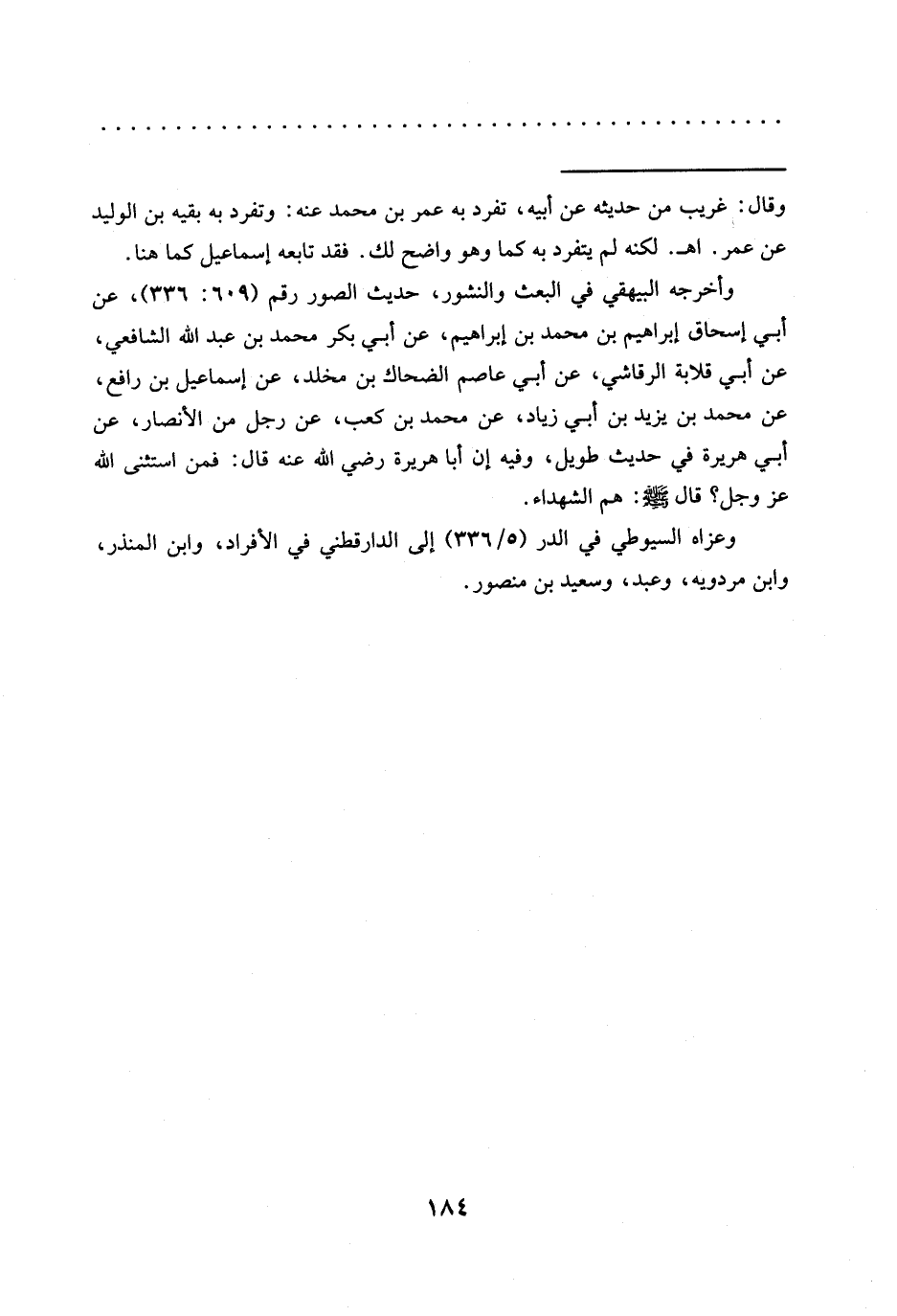 = وقال: غريب من حديثه عن أبيه، تفرد به عمر بن محمد عنه: وتفرد به بقيه بن الوليد عن عمر. اهـ. لكنه لم يتفرد به كما وهو واضح لك. فقد تابعه إسماعيل كما هنا. وأخرجه البيهقي في البعث والنشور، حديث الصور رقم (609: 336)، عن أبي إسحاق إبراهيم بن محمد بن إبراهيم، عن أبي بكر محمد بن عبد الله الشافعي، عن أبي قلابة الرقاشي، عن أبي عاصم الضحاك بن مخلد، عن إِسْمَاعِيلُ بْنُ رَافِعٍ، عَنْ مُحَمَّدِ بْنِ يَزِيدَ بن أبي زياد، عن محمد بن كعب، عَنْ رَجُلٍ مِنَ الْأَنْصَارِ، عَنْ أَبِي هُرَيْرَةَ في حديث طويل، وفيه إن أبا هريرة رضي الله عنه قال: فمن استثنى الله عزَّ وجلّ؟ قال -صلى الله عليه وسلم-: هم الشهداء.