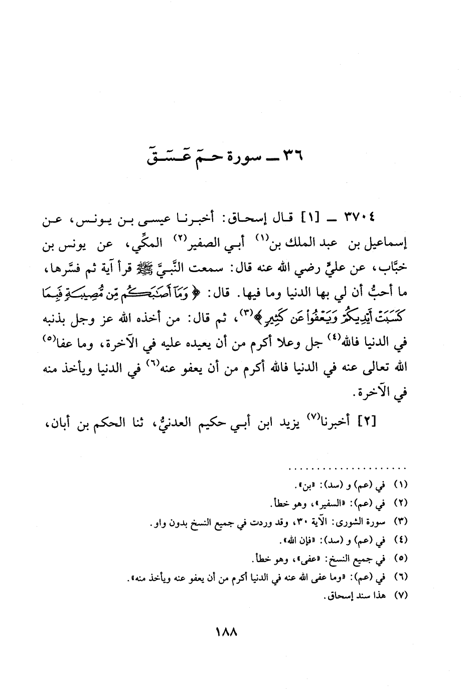 3704 -[1] قَالَ إِسْحَاقُ: أخبرنا عِيسَى بْنُ يُونُسَ، عَنْ إِسْمَاعِيلَ بْنِ عَبْدِ الْمَلِكِ بْنِ أَبِي الصَّفِيرِ الْمَكِّيِّ، عَنْ يُونُسَ بْنِ خَبَّابٍ، عَنْ عَلِيٍّ رَضِيَ الله عَنْه قَالَ: سَمِعْتُ النَّبِيَّ صَلَّى اللَّهُ عَلَيْهِ وَسَلَّمَ قَرَأَ آيَةً ثُمَّ فَسَّرَهَا، مَا أُحِبُّ أَنَّ لِي بِهَا الدُّنْيَا وَمَا فِيهَا. قَالَ: {وَمَا أَصَابَكُمْ مِنْ مُصِيبَةٍ فَبِمَا كَسَبَتْ أَيْدِيكُمْ وَيَعْفُوا عَنْ كَثِيرٍ} ، ثُمَّ قَالَ: §مَنْ أخذه الله عز وجل بِذَنْبِهِ فِي الدنيا فالله جل وعلا أَكْرَمُ مِنْ أَنْ يُعِيدَهُ عَلَيْهِ فِي الْآخِرَةِ، وَمَا عفا الله تعالى عَنْهُ فِي الدُّنْيَا فَاللَّهُ أَكْرَمُ مِنْ أَنْ يَعْفُوَ عَنْهُ فِي الدُّنْيَا وَيَأْخُذَ مِنْهُ فِي الْآخِرَةِ.