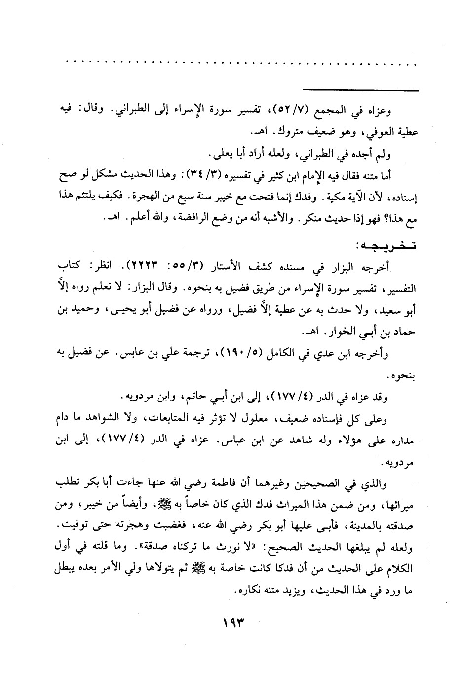 أخرجه البزّار في مسنده كشف الأستار (3/ 55: 2223). انظر: كتاب التفسير، تفسير سورة الإِسراء من طريق فضيل به بنحوه. وقال البزّار: لا نعلم رواه إلَّا أبو سعيد، ولا حدث به عن عطية إلَّا فضيل، ورواه عن فضيل أبو يحيى، وحميد بن حماد بن أبي الخوار. اهـ.
