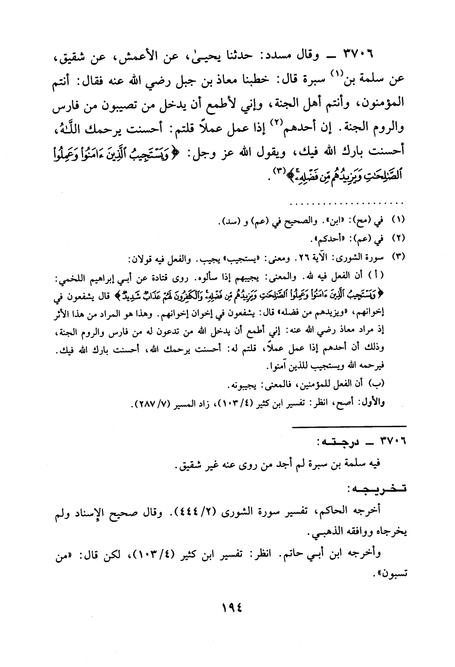 3706 - وَقَالَ مُسَدَّدٌ: حدثنا يَحْيَى، عَنِ الْأَعْمَشِ، عَنْ شَقِيقٍ، عَنْ سَلَمَةَ بْنِ سَبْرَةَ قَالَ: خَطَبَنَا مُعَاذُ بْنُ جَبَلٍ رَضِيَ الله عَنْه فَقَالَ: §أَنْتُمُ الْمُؤْمِنُونَ، وَأَنْتُمْ أَهْلُ الْجَنَّةِ، وَإِنِّي لَأَطْمَعُ أَنْ يَدْخُلَ مَنْ تُصِيبُونَ مِنْ فَارِسَ وَالرُّومِ الْجَنَّةَ. إِنَّ أَحَدَهُمْ إِذَا عَمِلَ عَمَلًا قُلْتُمْ: أَحْسَنْتَ يَرْحَمُكَ اللَّهُ، أَحْسَنْتَ بَارَكَ اللَّهُ فِيكَ، ويقول الله عز وجل: {وَيَسْتَجِيبُ الَّذِينَءَامَنُوا وَعَمِلُوا الصَّالِحَاتِ وَيَزِيدُهُمْ مِنْ فَضْلِهِ} .
