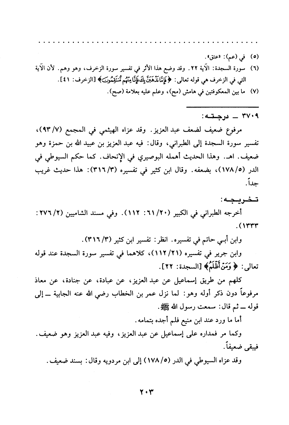 مرفوع ضعيف لضعف عبد العزيز. وقد عزاه الهيثمي في المجمع (7/ 93)، تفسير سورة السجدة إلى الطبراني، وقال: فيه عَبْدِ الْعَزِيزِ بْنِ عُبَيْدِ اللَّهِ بْنِ حَمْزَةَ وهو ضعيف. اهـ. وهذا الحديث أهمله البوصيري في الإِتحاف. كما حكم السيوطي في الدر (5/ 178)، بضعفه. وقال ابن كثير في تفسيره (3/ 316): هذا حديث غريب جدًا.