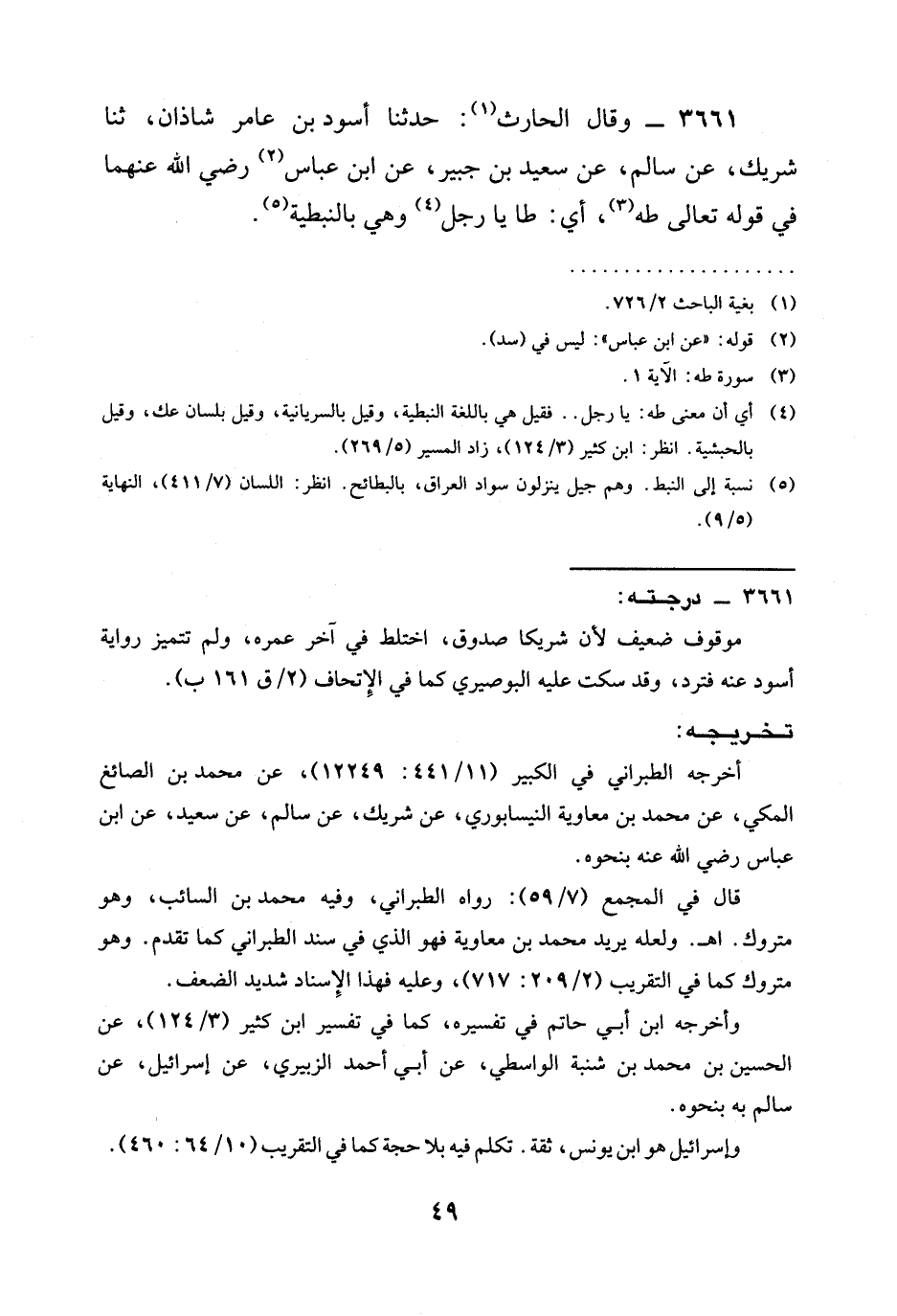 3661 - وَقَالَ الْحَارِثُ: حدثنا أَسْوَدُ بْنُ عَامِرٍ شَاذَانُ، ثنا شَرِيكٌ، عَنْ سَالِمٍ، عَنْ سَعِيدِ بْنِ جُبَيْرٍ، عَنِ ابْنِ عَبَّاسٍ رَضِيَ الله عَنْهما في قوله تعالى {§طَهْ} [طه: 1] ، أَيْ: طَأْ يَا رَجُلُ وَهِيَ بِالنَّبَطِيَّةِ.