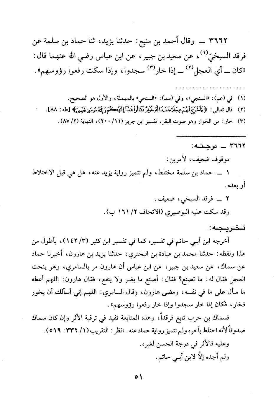 3662 - وَقَالَ أَحْمَدُ بْنُ مَنِيعٍ: حدثنا يَزِيدُ، ثنا حَمَّادُ بْنُ سَلَمَةَ عَنْ فَرْقَدٍ السَّبَخِيِّ، عَنْ سَعِيدِ بْنِ جُبَيْرٍ، عَنِ ابْنِ عَبَّاسٍ رَضِيَ الله عَنْهما قَالَ: " كَانَ - أَيِ §الْعِجْلُ - إِذَا خَارَ سَجَدُوا، وَإِذَا سَكَتَ رَفَعُوا رؤوسهم ".