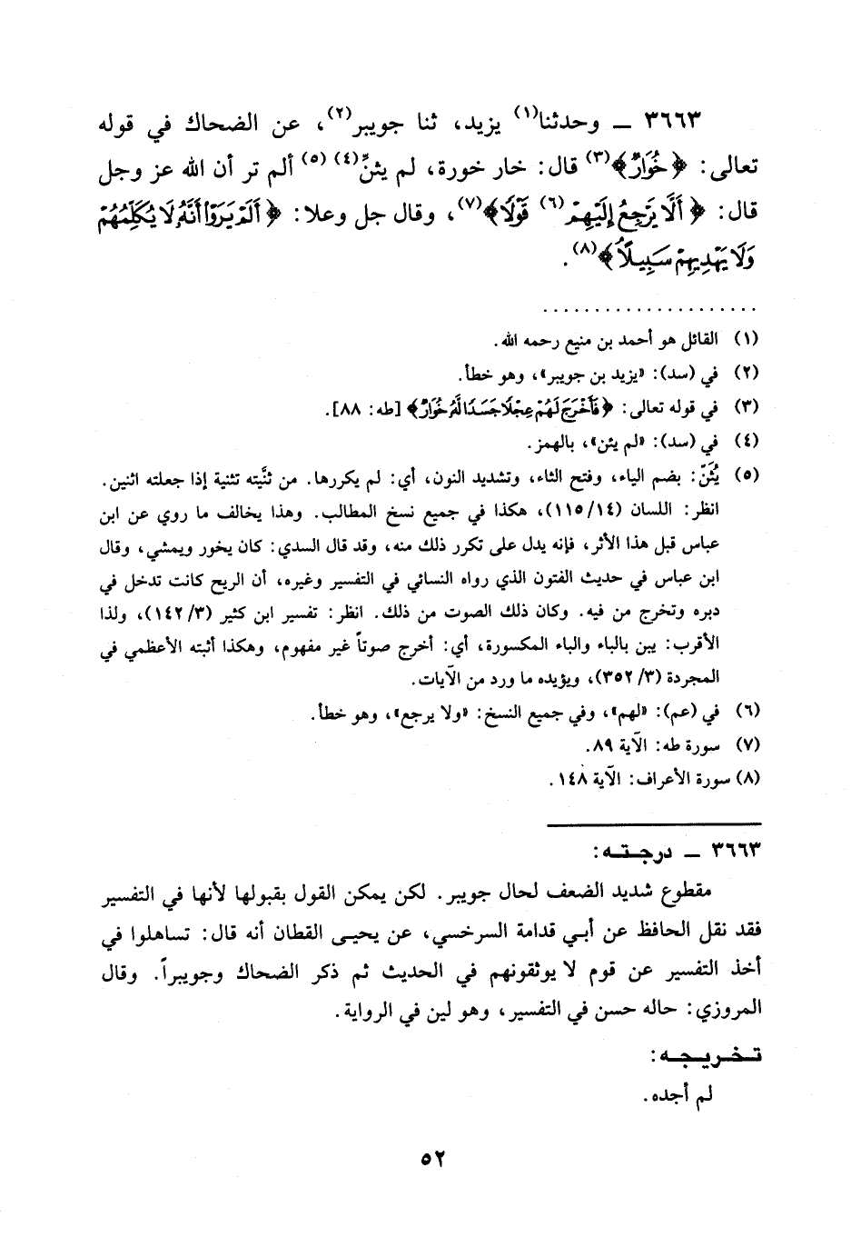 3663 - وحدثنا يَزِيدُ، ثنا جُوَيْبِرٌ، عَنِ الضَّحَّاكِ فِي قَوْلِهِ تَعَالَى: {§خُوَارٌ} [الأعراف: 148] قَالَ: خَارَ خَوْرَةً، لَمْ يُثَنِّ أَلَمْ تَرَ أن الله عز وجل قَالَ: {أَلَّا يَرْجِعَ إِلَيْهِمْ قَوْلًا} ، وَقَالَ جل وعلا: {أَلَمْ يَرَوْا أَنَّهُ لَا يُكَلِّمُهُمْ وَلَا يَهْدِيهِمْ سَبِيلًا} .