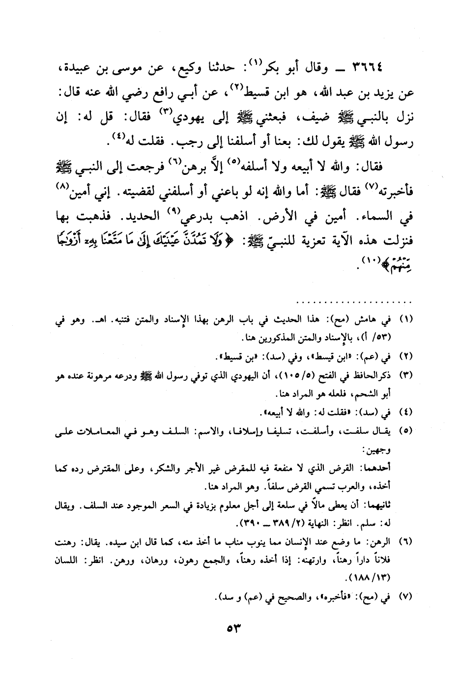 3664 - وَقَالَ أَبُو بَكْرٍ: حدثنا وَكِيعٌ، عَنْ مُوسَى بْنِ عُبَيْدَةَ، عَنْ يَزِيدَ بْنِ عَبْدِ اللَّهِ، هو ابن قُسَيْطٍ، عَنْ أَبِي رَافِعٍ رَضِيَ الله عَنْه قَالَ: نَزَلَ بِالنَّبِيِّ صَلَّى اللَّهُ عَلَيْهِ وَسَلَّمَ ضَيْفٌ، فَبَعَثَنِي صَلَّى اللَّهُ عَلَيْهِ وَسَلَّمَ إِلَى يَهُودِيٍّ فَقَالَ: قُلْ لَهُ: إِنَّ رَسُولَ اللَّهِ صَلَّى اللَّهُ عَلَيْهِ وَسَلَّمَ يَقُولُ لَكَ: §بِعْنَا أَوْ أَسْلِفْنَا إِلَى رَجَبٍ. فَقُلْتُ لَهُ.