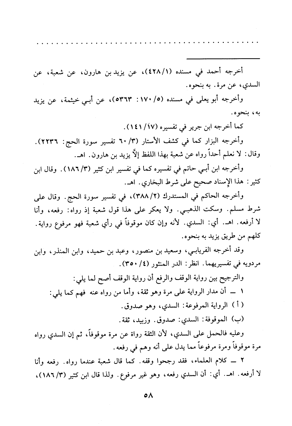 2 - كلام العلماء، فقد رجحوا وقفه. كما قال شعبة عندما رواه. رفعه وأنا لا أرفعه. اهـ. أي: أن السدي رفعه، وهو غير مرفوع. ولذا قال ابن كثير (3/ 186)، =