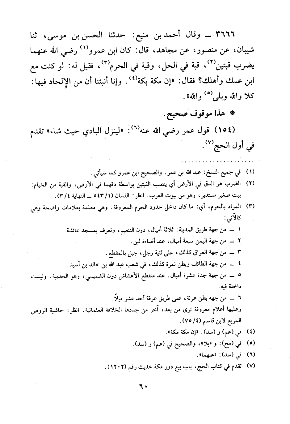 3666 - وَقَالَ أَحْمَدُ بْنُ مَنِيعٍ: حدثنا الْحَسَنُ بْنُ مُوسَى، ثنا شَيْبَانُ، عَنْ مَنْصُورٍ، عَنْ مُجَاهِدٍ، قَالَ: كَانَ ابْنُ عمرو رَضِيَ الله عَنْهما يَضْرِبُ قُبَّتَيْنِ، قُبَّةً فِي الْحِلِّ، وَقُبَّةً فِي الحرم، فَقِيلَ لَهُ: لَوْ كُنْتَ مَعَ ابْنِ عَمِّكَ وَأَهْلِكَ؟ فَقَالَ: " إِنَّ مَكَّةَ بَكَّةُ. وَإِنَّا أُنْبِئْنَا أَنَّ §مِنَ الْإِلْحَادِ فِيهَا: كَلَّا وَاللَّهِ وَبَلَى وَاللَّهِ ".